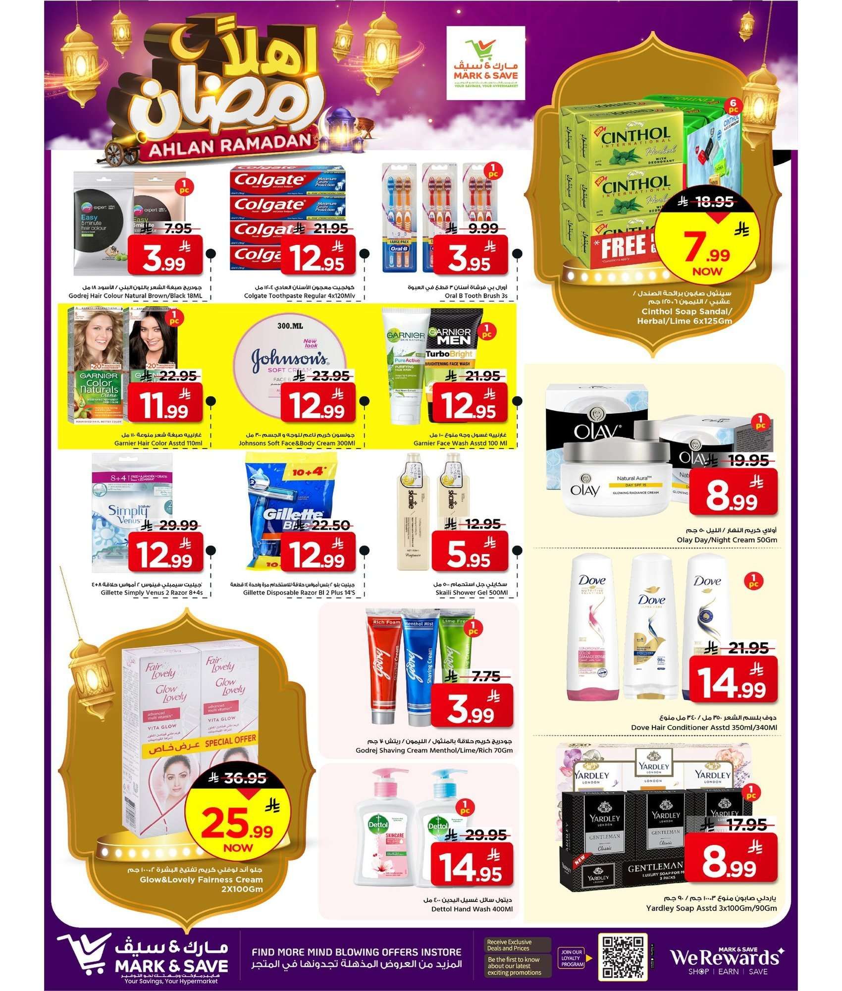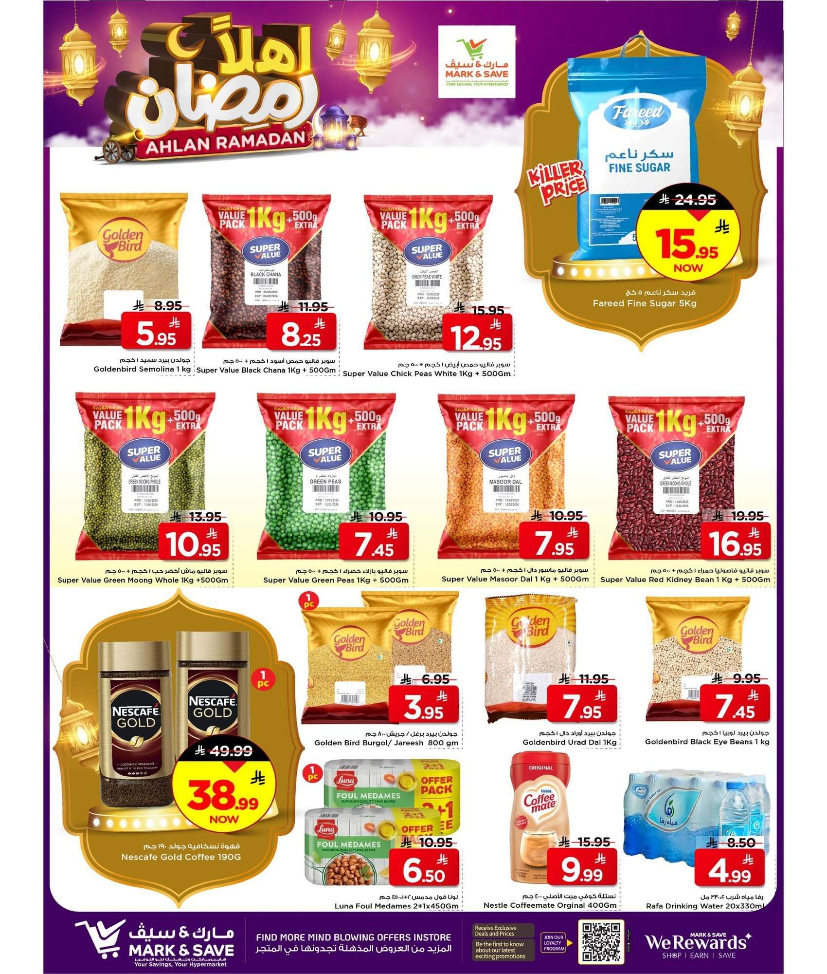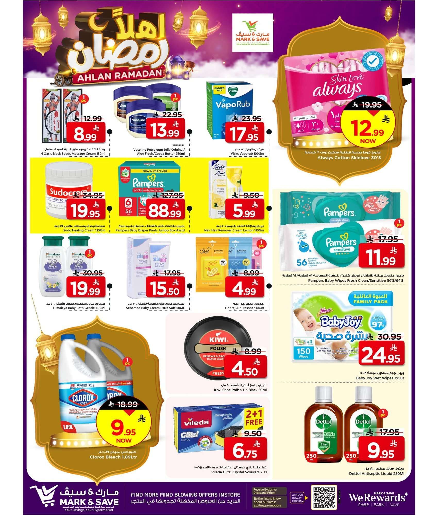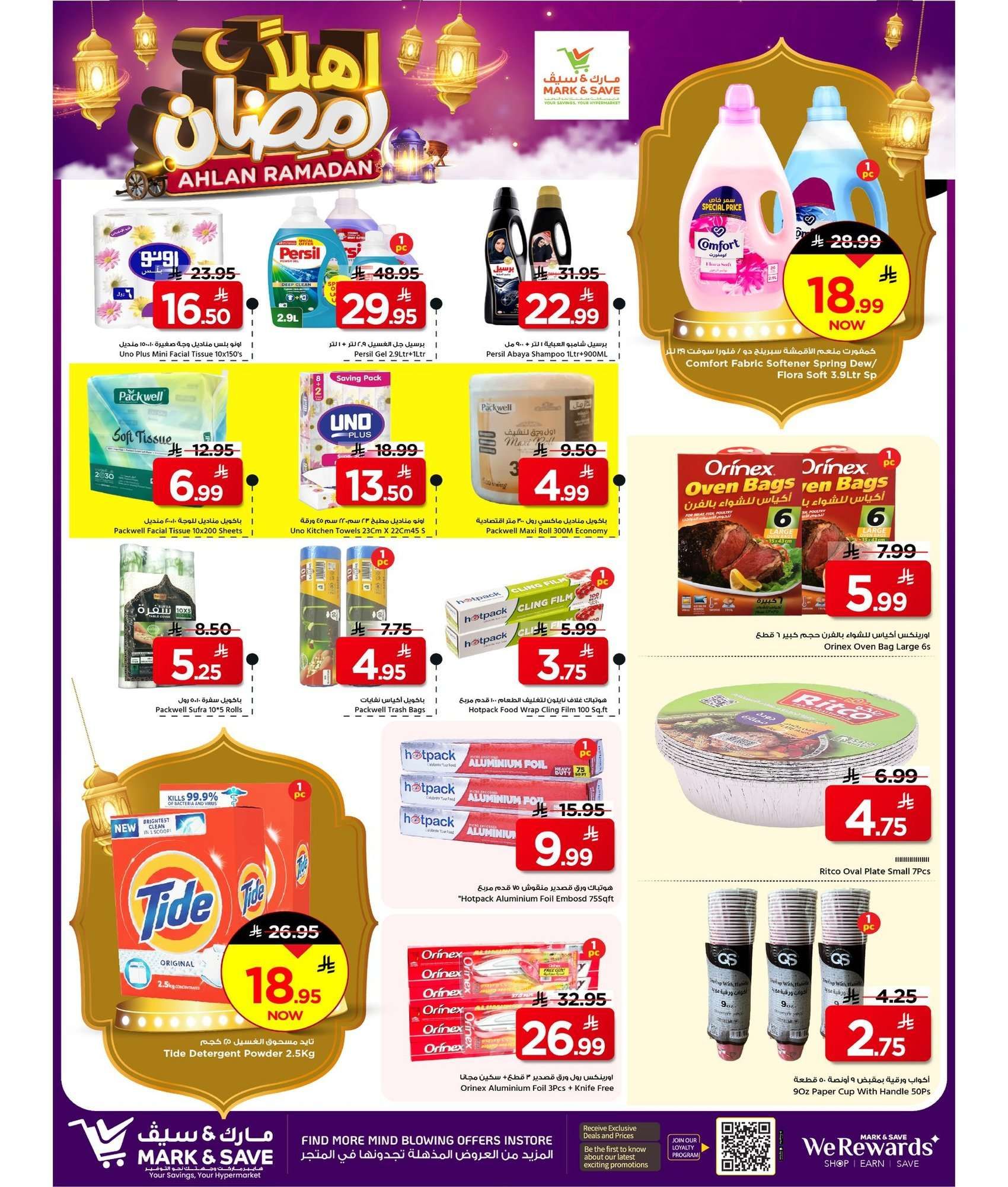 عروض مارك اند سيف الرياض الأربعاء 9-8-1447هـ الموافق 28 يناير 2026 و تشمل سمك الشيلم وزيت عباد الشمس والمكرونة والفاكهة المجففة والأجبان واللحوم الباردة والأرز الهندي والسكر ودقيق البر والحليب والقهوة والشاي وتتبعها الأجهزة المنزلية منها غسالة صحون ومفرمة خضروات وشواية كهربائية ومكواة ملابس وشاشة ذكية ومحضر طعام وقلاية هوائية