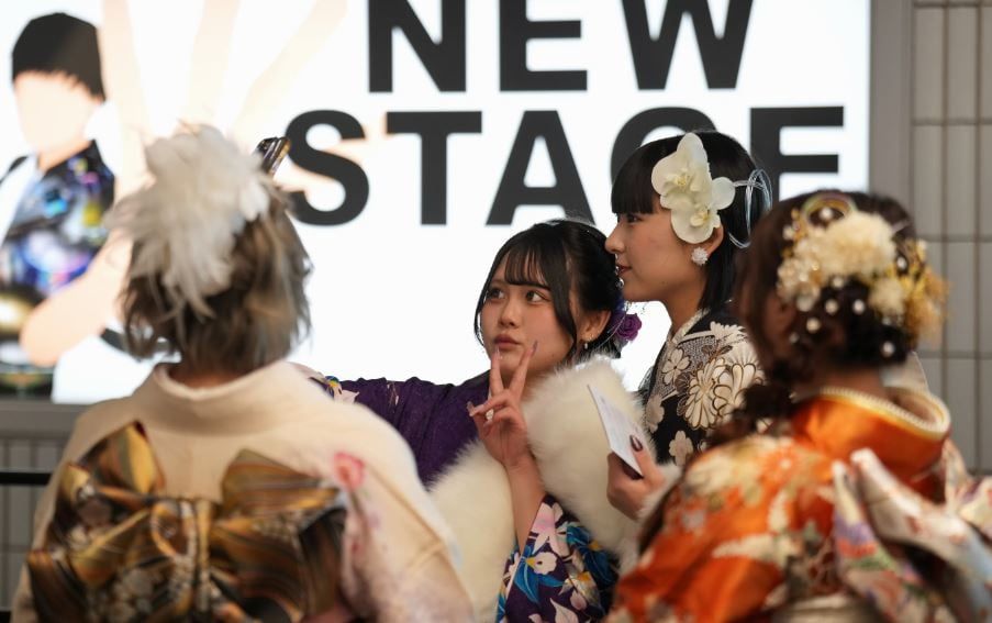 يُعدّ يوم بلوغ سن الرشد طقساً عاماً شائعاً في اليابان. قبل وبعد الاحتفالات القصيرة، كان الشباب يتبادلون التحية مع أصدقائهم على الأرصفة وفي محطات القطار القريبة، ورفعوا هواتفهم الذكية مراراً وتكراراً لالتقاط صور السيلفي وصور لبعضهم البعض.