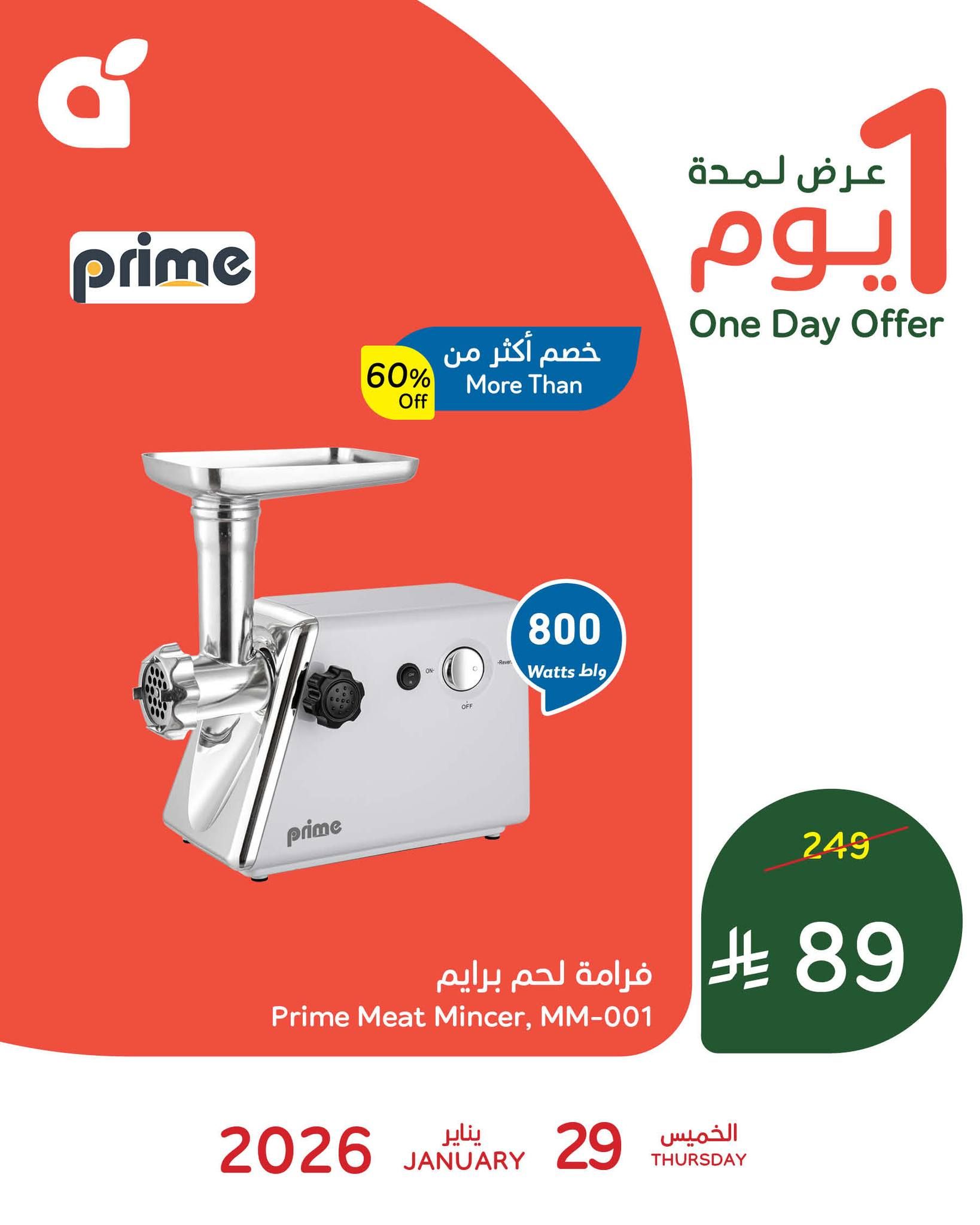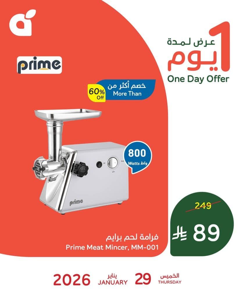 بنده اليوم الخميس 29 يناير 2026 الموافق 10 شعبان 1447هـ و تشمل افضل و اقوي الادوات و الاجهزة المنزلية منها فرامة برايم و بتوفر كمان طقم أواني ستانلس ستيل جراندي كوك في عرض حصري بنصف السعر متاح اليوم فقط تابعونا لمعرفة كل جديد عن عروض علي موقعكم عروض توداي .