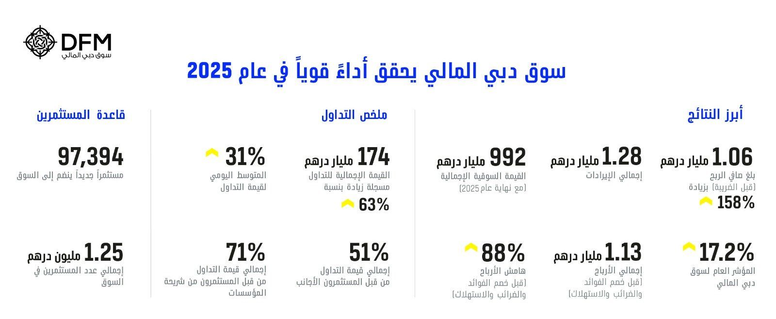 وسجلت القيمة الإجمالية للتداول 174 مليار درهم، مرتفعة بنسبة 63% مقارنةً بالعام السابق، فيما ارتفع مؤشر سوق دبي المالي بنسبة 17.2% خلال 2025، محققاً مكانة راسخة للسوق كمنصة مالية عالمية ديناميكية وموثوقة.