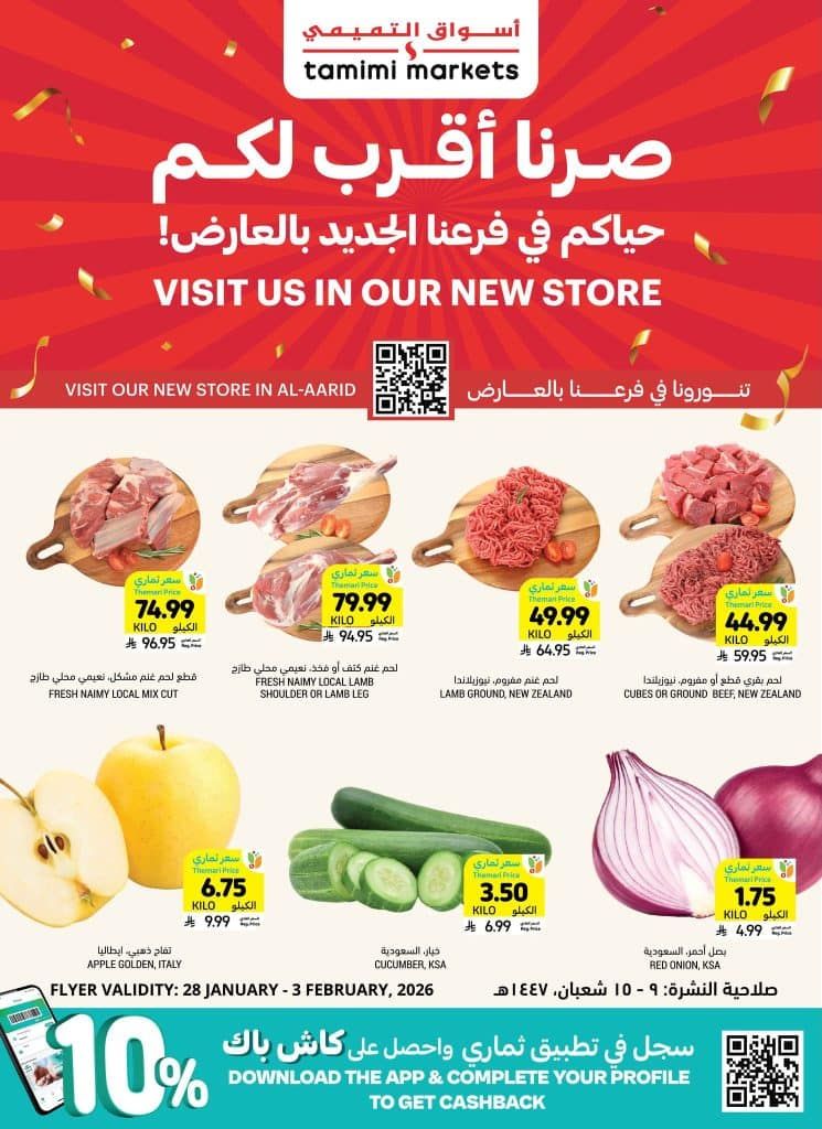 التميمي الخميس 29-1-2026 الموافق 10 شعبان 1447هـ و تحتوي علي شكيلة واسعة من اللحوم الطازجة كالغنم النعيمي المحلي والمفروم البقري النيوزيلندي إلى جانب الخضروات والفواكه الأساسية مثل البصل الأحمر والخيار والتفاح الإيطالي كما تشمل سلع تموينية متنوعة من زيوت الزيتون ودوار الشمس والمعكرونة