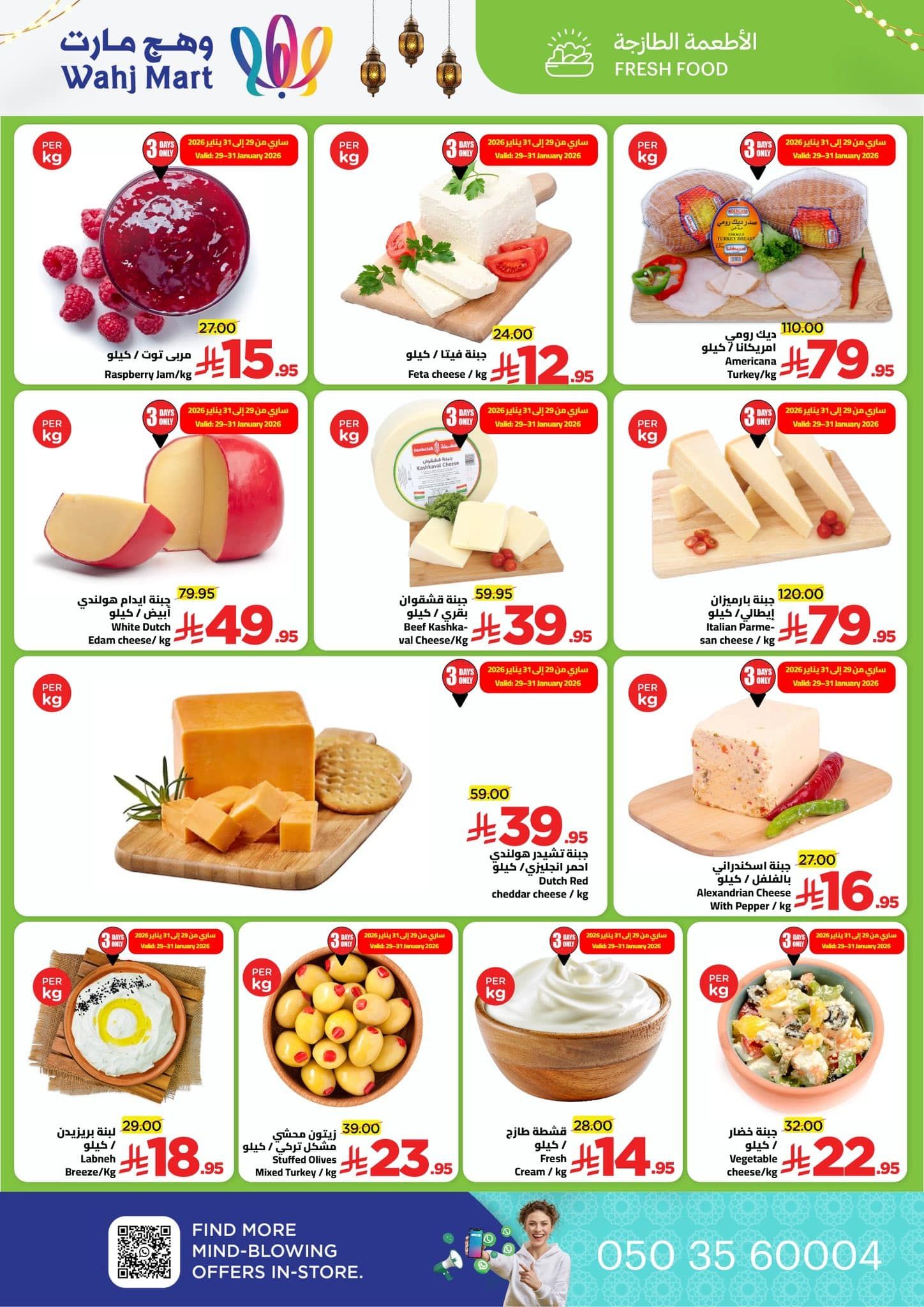 عروض وهج مارت جدة الخميس 29-1-2026 الموافق 10 شعبان 1447هـ و تحتوي علي اللحوم مثل الموزات والريش والكتف إلى جانب اللحم البقري والعجل والكبدة والسجق كما يوفر قسم الأجبان خيارات عالمية مثل البارميزان الإيطالي والقشقوان والإيدام الهولندي والتشيدر بالإضافة إلى الفواكه والخضروات الشهية و باسعار تنافسية .