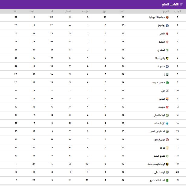 يعتلى فريق سيراميكا صدارة ترتيب جدول الدوري المصري قبل الأربعاء، برصيد 32 نقطة وجاء بيراميدز في المركز الثاني برصيد 28 نقطة.