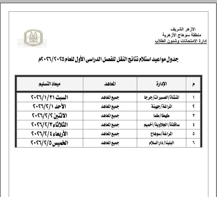 الجمعة، 30 يناير 2026 02:00 صأعلنت منطقة سوهاج الأزهرية، ، عن جدول مواعيد استلام نتائج امتحانات النقل للفصل الدراسي الأول للعام الدراسي 2025 / 2026، وذلك من خلال إدارة الامتحانات وشئون الطلاب، على مستوى الإدارات التعليمية الأزهرية بالمحافظة.