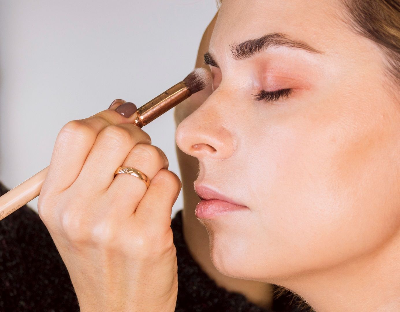 - بعد وضع قاعدة الجفن البيج المطفية، تأتي خطوة اختيار اللون الانتقالي المناسب. اختاري درجة بنية فاتحة أو روزي - براون خفيفة وادمجيها في كسرة العين بحركة دائرية واسعة. هذه الخطوة تظهر العين أكبر وأكثر اتساعاً، وتمنح المكياج لمسة احترافية رغم بساطته.