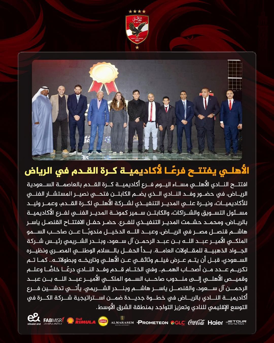 وفي الختام قدم وفد النادي درعا خاصا وعلم وقميص الأهلي إلى مندوب صاحب السمو الملكي الأمير عبد الله بن عبد الرحمن آل سعود، والقنصل ياسر هاشم وبندر الشريمي. يأتي تدشين فرع أكاديمية النادي بالرياض في خطوة جديدة ضمن استراتيجية شركة الكرة في التوسع الإقليمي للنادي وتعزيز التواجد بمنطقة الشرق الأوسط.