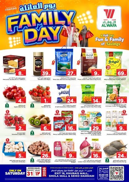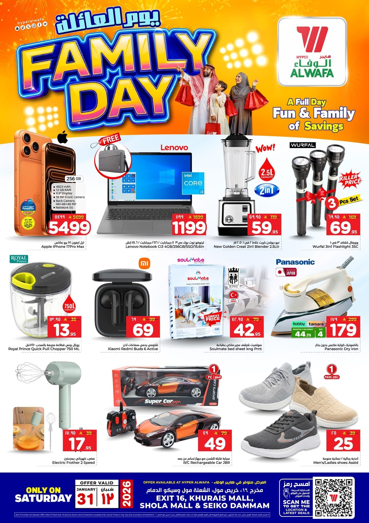 عروض الوفاء هايبر ماركت السبت 31 يناير 2026 الموافق 11 شعبان 1447هـ و تحتوي علي جوالات آيفون ولابتوبات لينوفو وسماعات شاومي وخلاطات ومكاوي باناسونيك وكشافات يدوية وأدوات مطبخ وقطاعات خضار ومفارش أسرة وألعاب أطفال وأحذية رجالية ونسائية إضافة إلى السلع الغذائية مثل الأرز والحليب المجفف والدجاج الطازج