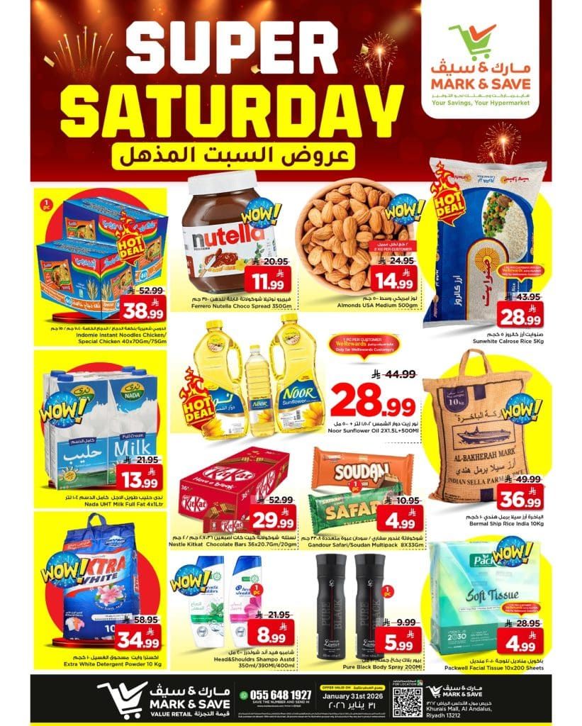 عروض مارك اند سيف الرياض السبت 31-1-2026 الموافق 11 شعبان 1447هـ و بتحتوي علي تشكيلة من المنتجات الغذائية و الاستهلاكية المختلفة و بالاضافة الي توافر افضل العروض علي المنظفات و مساحيق الغسيل و غيرها من المنتجات و باسعار تنافسية متاحة اليوم فقط ابقوا معنا ليصلكم كل جديد عن عروض السعودية