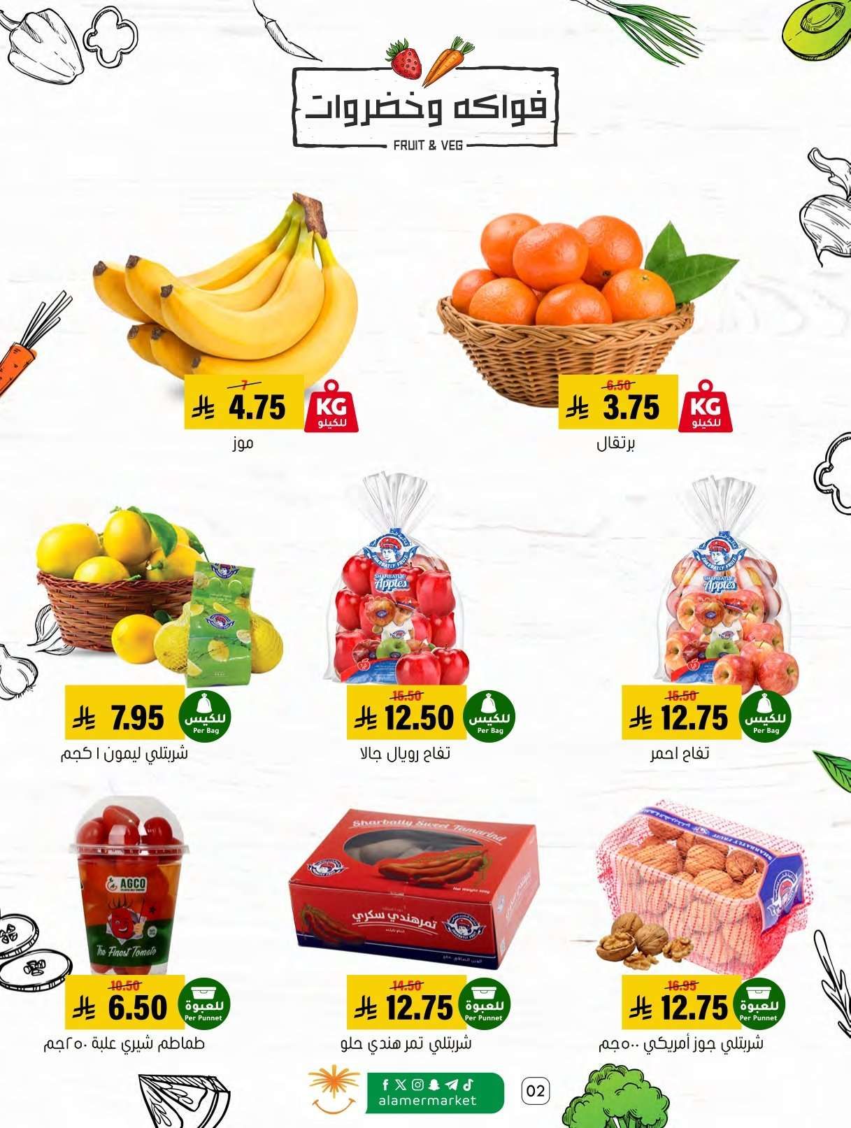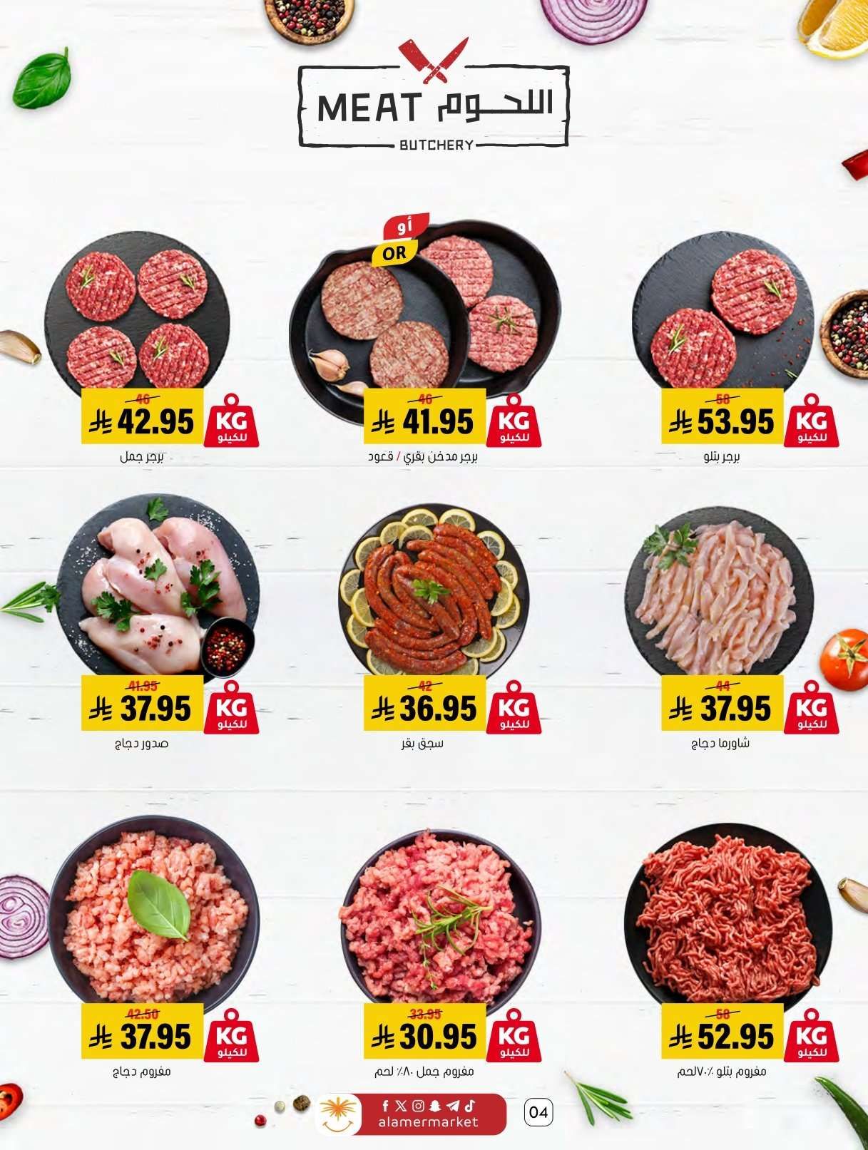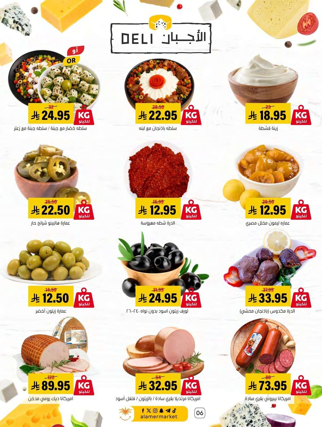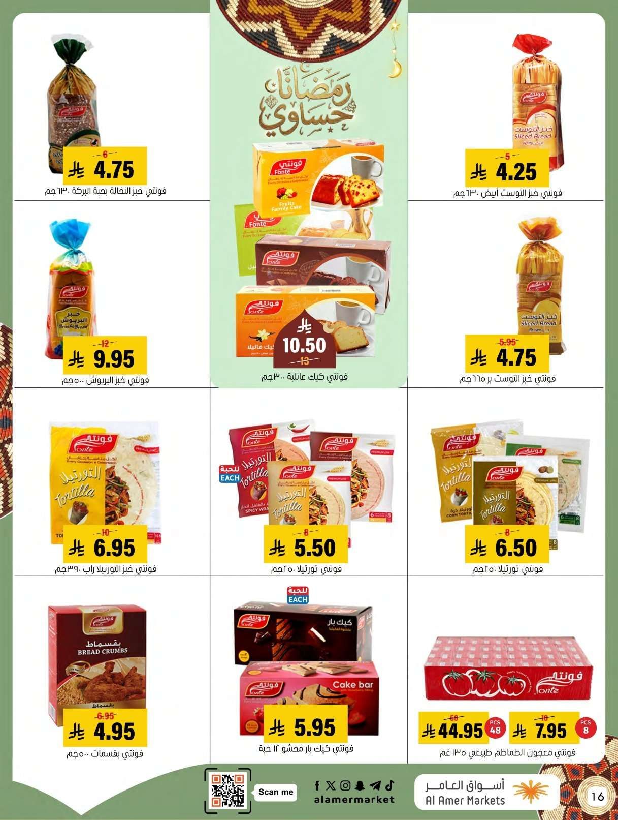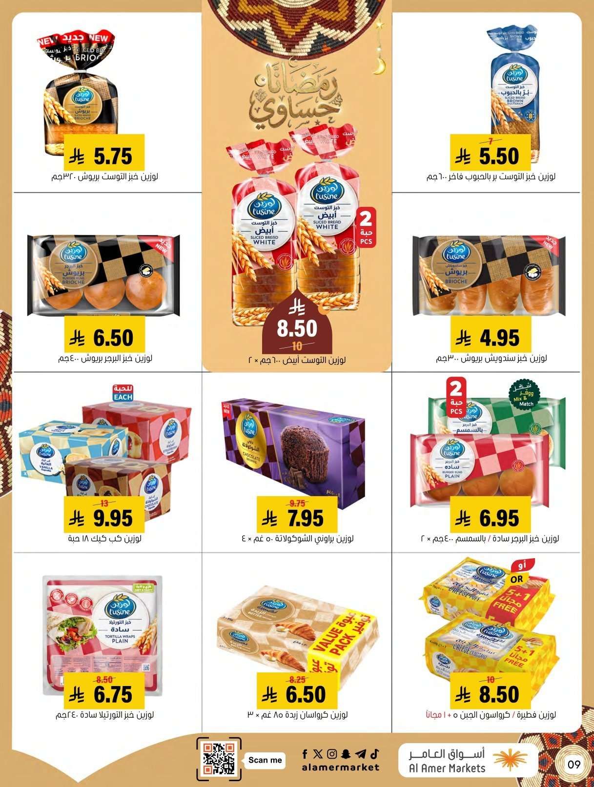 اسواق العامر السبت 31-1-2026 الموافق 11 شعبان 1447هـ و تحتوي علي لحم غنم سواكني ولحم حاشي ولحم بقر وصدور دجاج وبرجر ودجاج مفروم وأجبان متنوعة مثل الفيتا والشيدر والقشقوان ولبنة بينار وزيتون ومرتديلا وموز وبرتقال وتفاح وطماطم وتمر هندي وجوز أمريكي وتوست وأخباز لوزين وكب كيك وكرواسان
