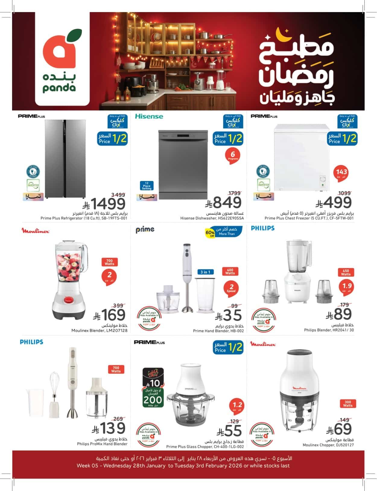 عروض بنده الاسبوعية حتي الثلاثاء 3 فبراير 2026 الموافق 14 شعبان 1447هـ و تحتوي علي تشكيلة متنوعة من الأجهزة المنزلية والكهربائية حيث تشمل ثلاجات وغسالات صحون وفريزر أرضي ومحضرات طعام وخلاطات يدوية وخلاطات عادية وفرامات لحم ومطاحن قهوة وقلايات هوائية وشوايات بانيني وغلايات مياه كهربائية ومحمصة خبز