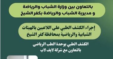 السبت، 31 يناير 2026 02:48 مأعلنت مديرية الشباب والرياضة بكفر الشيخ، عن فتح باب الحجز لإجراء الكشف الطبي على اللاعبين بالهيئات الشبابية والرياضية، بوحدة الطب الرياضي ابتداءً من يوم الإثنين المقبل، 2 فبراير2026، بالتعاون مع وزارة الشباب والرياضة "الإدارة المركزية للطب الرياضي، الإدارة العامة لشؤون الوحدات والمراكز الطبية" وفق قرار الدكتور أشرف صبحي وزير الشباب والرياضة، الخاص بتخفيض التكاليف المالية الخاصة بإجراءات الكشف الطبي والكود الطبي للرياضيين بوحدات الطب الرياضي التابعة للوزارة في المحافظات، للتخفيف عن كاهل اللاعبين والأندية والهيئات الرياضية .
