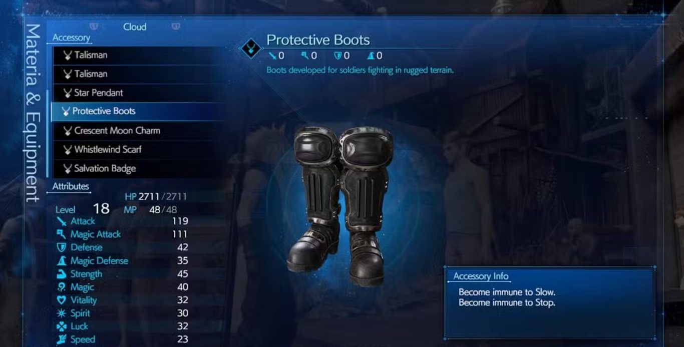 رغم أن Protective Boots لا تضيف أي زيادة رقمية مباشرة إلى الإحصائيات القتالية إلا أن قيمتها الحقيقية تكمن في تأثيرها الدفاعي الفريد الذي يجعل الشخصية محصنة بالكامل من تأثيري Slow و Stop أثناء القتال.