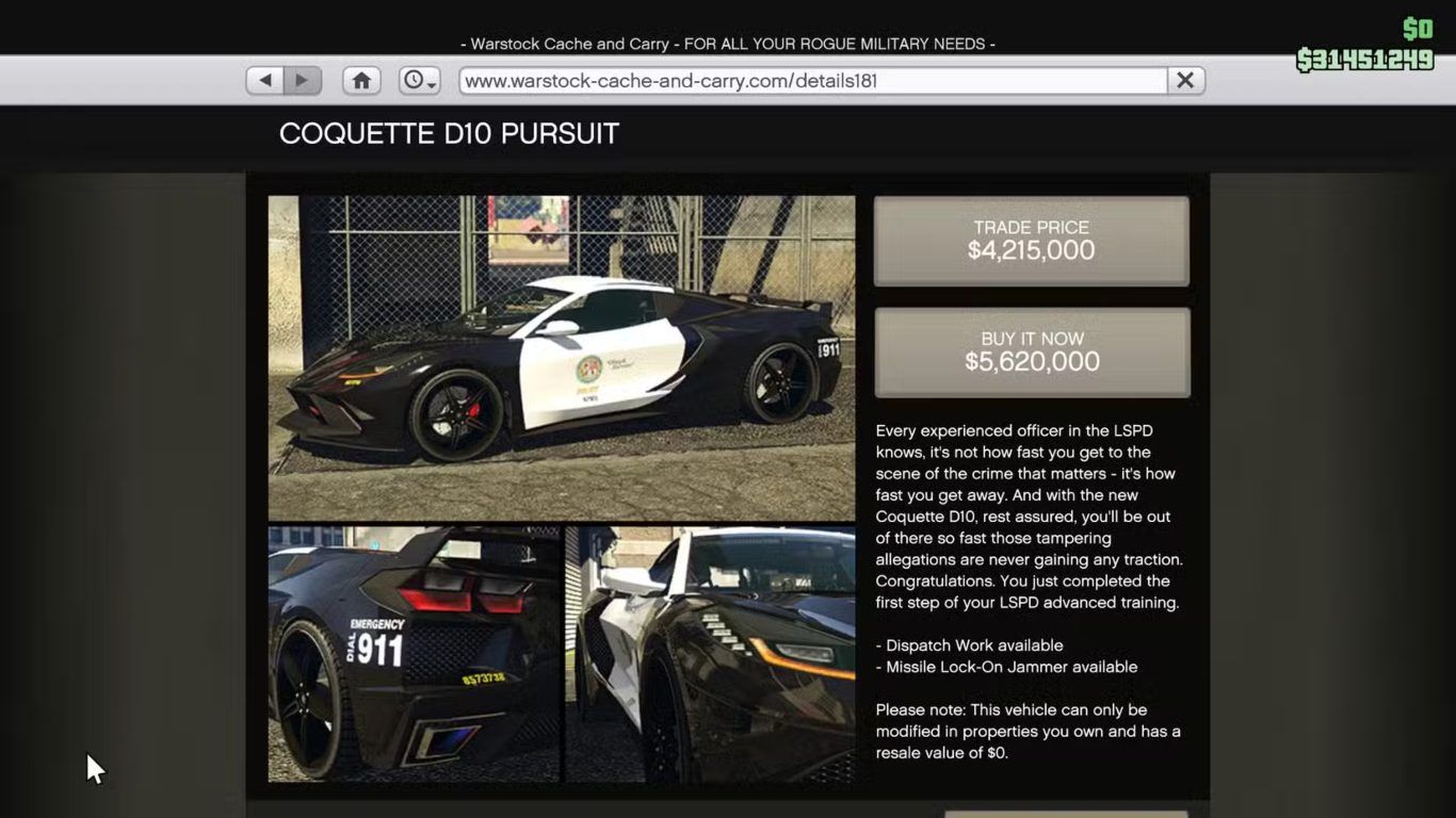 يمكن شراء Coquette D10 Pursuit من متجر Warstock Cache And Carry مقابل سعر يبلغ 5620000 وهو سعر يعكس ندرة السيارة وطبيعتها الخاصة ودورها المختلف مقارنة بباقي المركبات الشرطية المتاحة داخل اللعبة.
