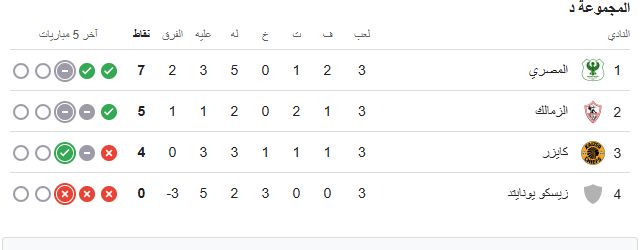 ويتصدر المصري البورسعيدي ترتيب المجموعة برصيد 7 نقاط، يليه الزمالك في المركز الثاني برصيد 5 نقاط، ثم كايزر في المركز الثالث برصيد 4 نقاط، بينما يتذيل زيسكو يونايتد المجموعة دون رصيد من النقاط، ما يزيد من أهمية المواجهة في صراع الصدارة والتأهل.