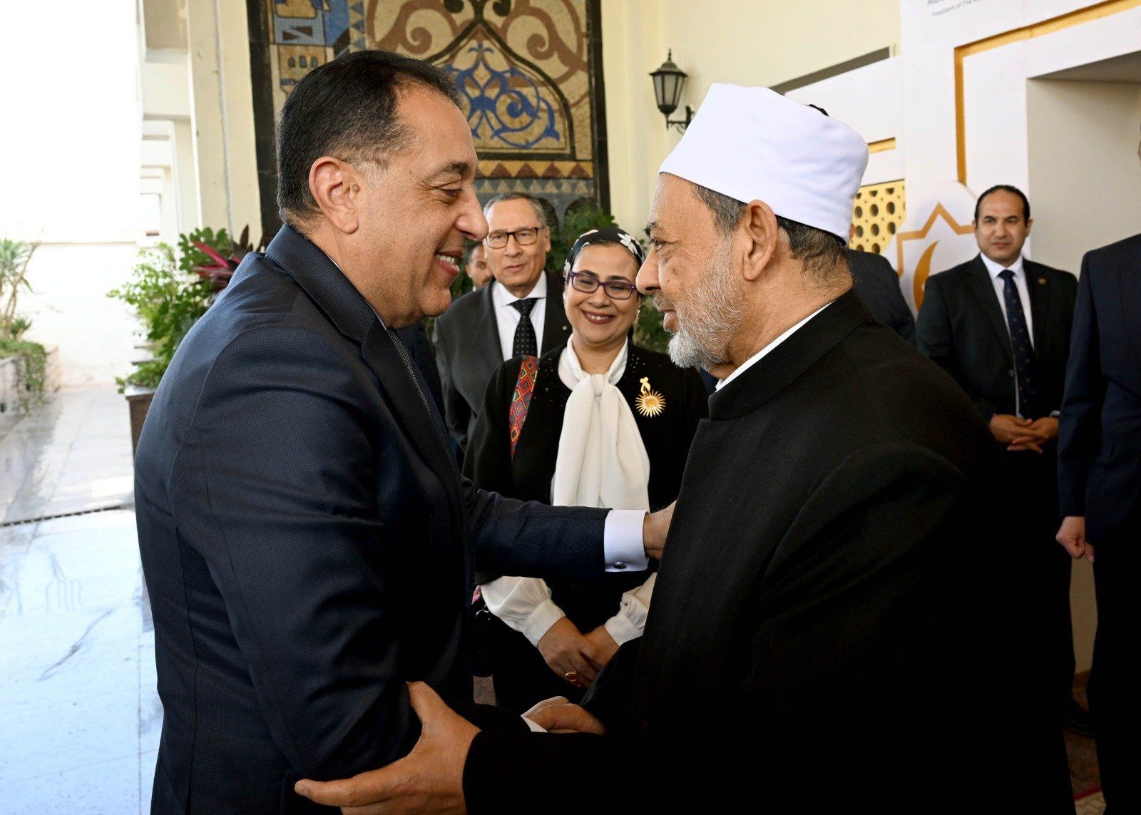 وكان في استقبال رئيس مجلس الوزراء لدى وصوله، فضيلة الإمام الأكبر، الدكتور أحمد الطيب، شيخ الأزهر الشريف، والسيدة المستشارة/ أمل عمار، رئيس المجلس القومي للمرأة، رئيس المجلس الوزاري لمنظمة تنمية المرأة.