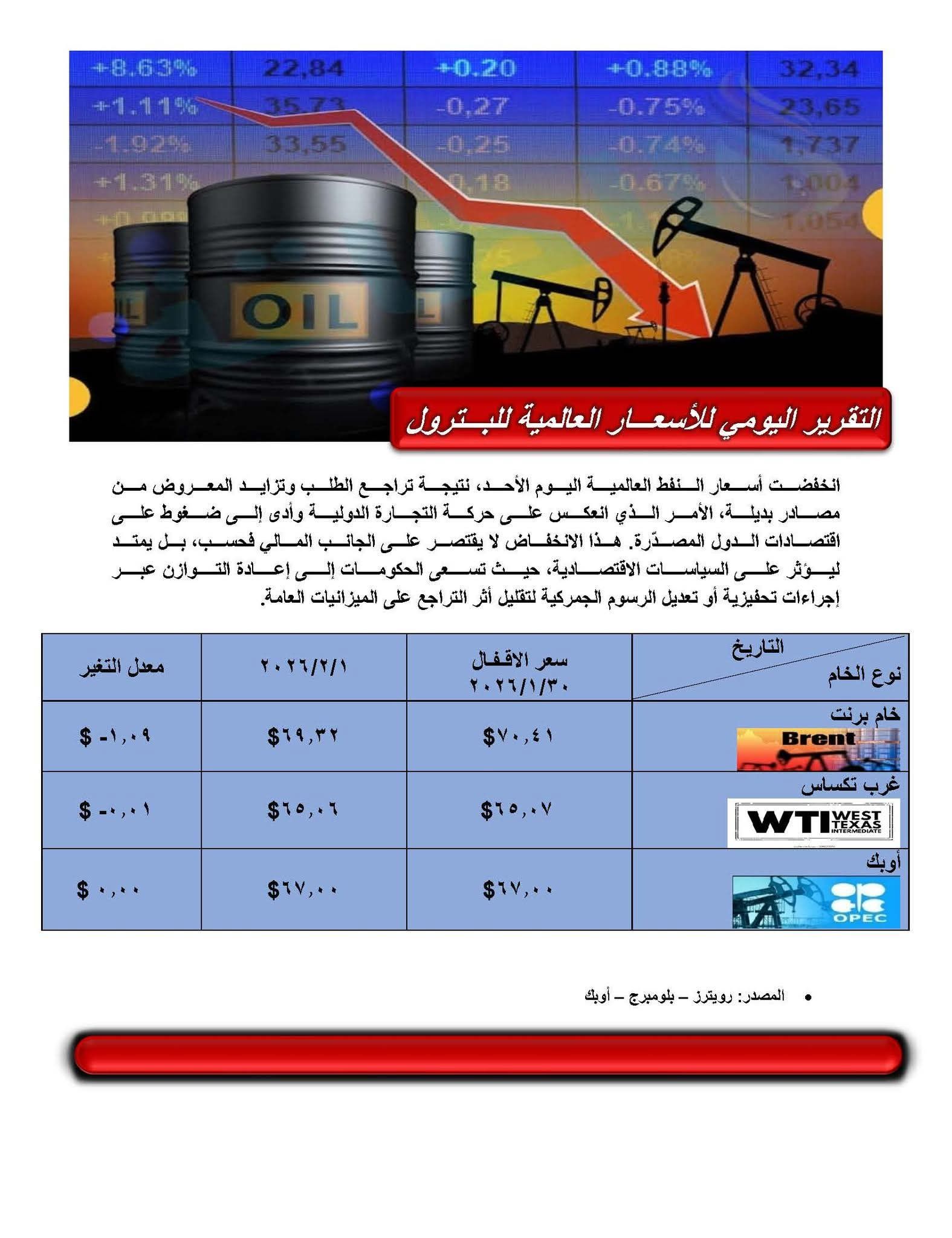 نشرت الهيئة المصرية العامة للبترول على صفحتها بمواقع التواصل الاجتماعى الأسعار العالمية للبترول اليوم الأحد الموافق1-2-2026.