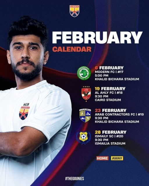 يخوض الفريق الكروى الأول للجونة 4 مباريات خلال شهر فبراير الجارى بالدورى يبدأها بمواجهة مودرن سبورت في السادس من فبراير باستاد خالد بشارة بالبحر الأحمر، ثم يخرج لمواجهة الأهلى في التاسع عشر من الشهر نفسه باستاد القاهرة في التاسعة والنصف مساء.
