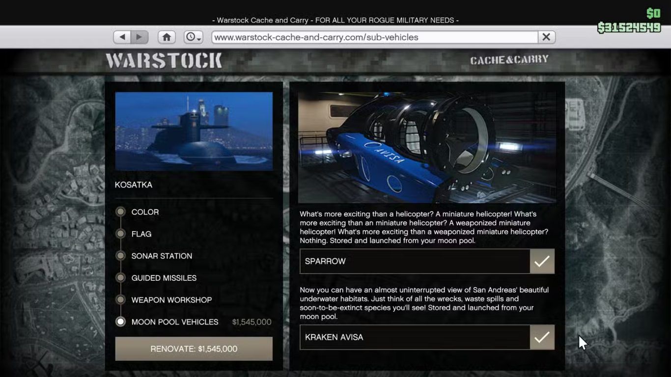 يتم شراء Kraken Avisa كمركبة Moon Pool خاصة بـ Kosatka مقابل مبلغ كبير مقارنة بوظيفتها المحدودة. هذا المبلغ لا يضيف أي ميزة حقيقية لمسار التقدم ولا يفتح محتوى جديدا أو مهاما خاصة تبرر التكلفة. الرحلات تحت الماء باستخدام هذه الغواصة بطيئة للغاية وتستغرق وقتا طويلا دون مقابل فعلي.