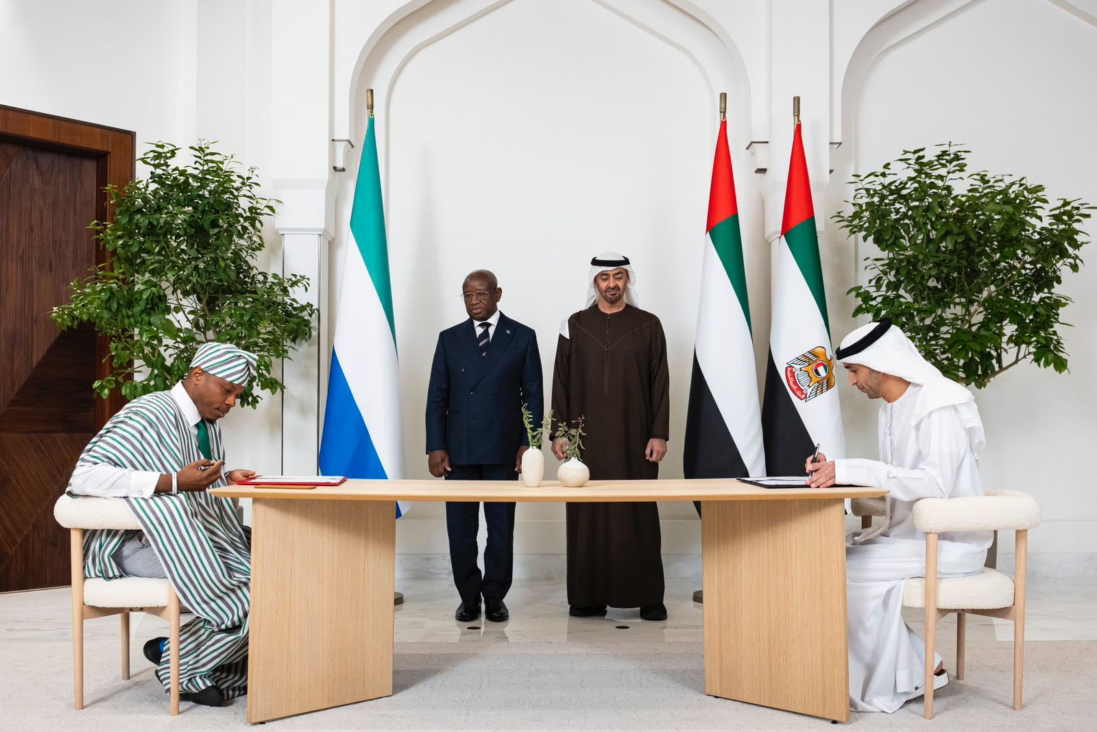 شهد صاحب السمو الشيخ محمد بن زايد آل نهيان، رئيس الدولة، حفظه الله، ورئيس جمهورية سيراليون جوليوس مادا بيو، توقيع اتفاقية الشراكة الاقتصادية الشاملة في أبوظبي.