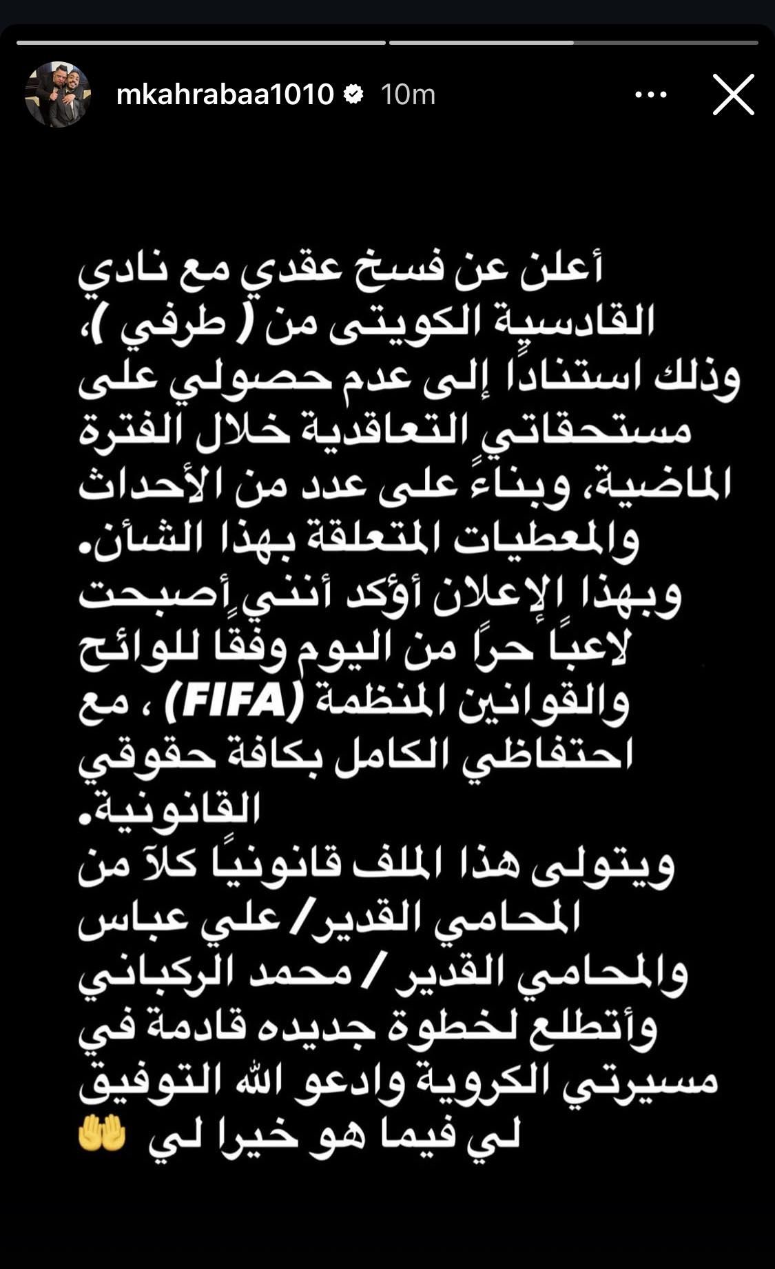 أعلن محمود كهربا لاعب القادسية الكويتى فسخ تعاقده مع ناديه من طرفه لعدم حصوله على مستحقاته المالية من النادى الكويتى على مدار الفترة الماضية.