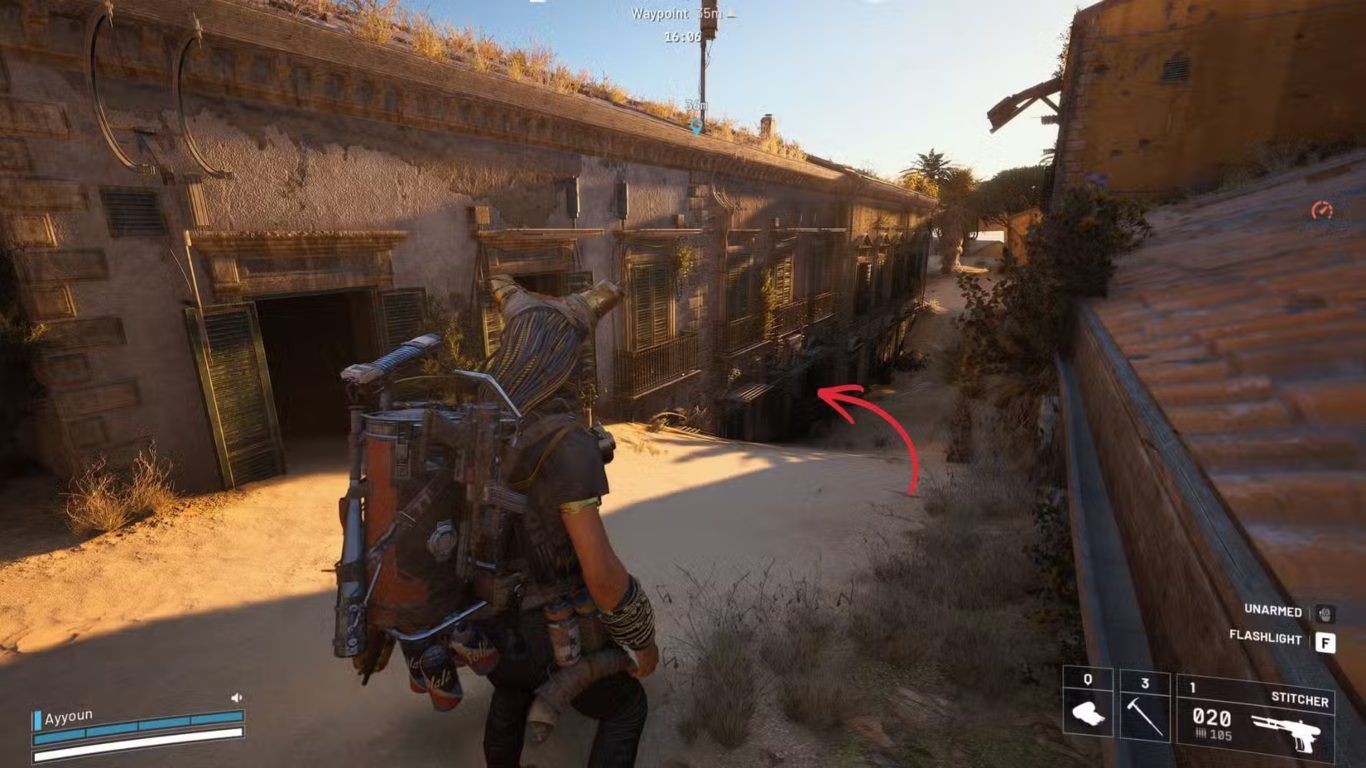 بعد الدخول إلى المبنى المهجور يجب التقدم مباشرة نحو الفتحة الموجودة في الجدار من الجهة اليمنى حيث يؤدي المرور من خلالها إلى مساحة داخلية سفلية تُمكّن اللاعب من رؤية الغرفة المغلقة مباشرة عند قاعدة الدرج.