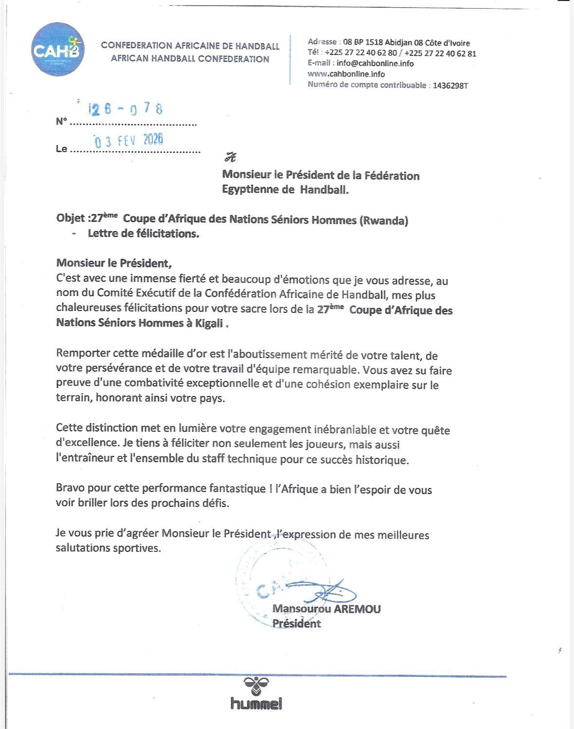الثلاثاء، 03 فبراير 2026 03:24 متلقى الاتحاد المصري لكرة اليد خطاب تهنئة رسمي من الاتحاد الأفريقي لكرة اليد، برئاسة منصور أريمو، بمناسبة تتويج منتخب مصر بلقب بطولة كأس الأمم الأفريقية لكرة اليد للرجال، التي أقيمت مؤخرًا في كيجالي عاصمة رواندا.