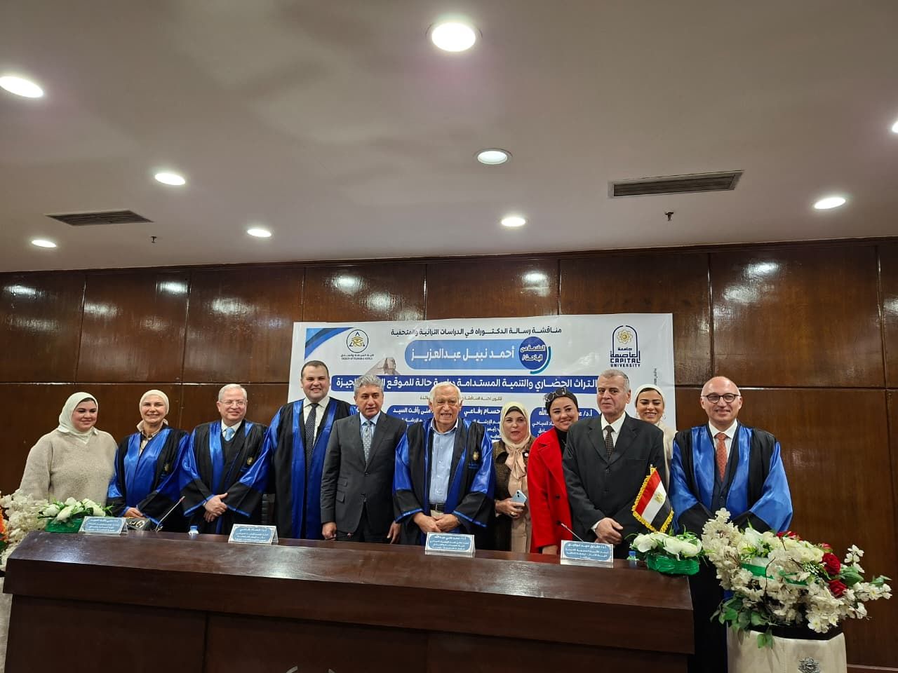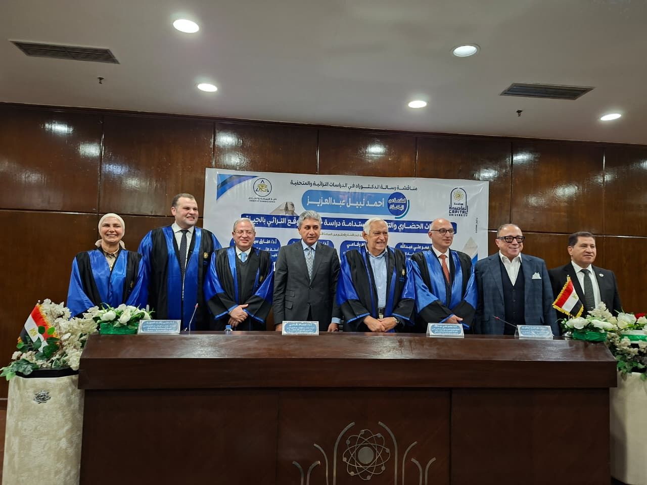 ‎وقد تكونت لجنة الحكم والمناقشة من نخبة من الأساتذة المتخصصين، وهم الدكتور علي عمر عبد الله الأستاذ المتفرغ بقسم الإرشاد السياحي بجامعة العاصمة ونائب رئيس الجامعة الأسبق للدراسات العليا، رئيساً ومناقشاً، الدكتور حسام رفاعي الأستاذ بقسم الإرشاد السياحي ونائب رئيس الجامعة لشئون التعليم والطلاب بجامعة العاصمة، مشرفاً، والدكتورة منى مصطفى رأفت الأستاذ بقسم الإرشاد السياحي، مشرفًا، والدكتور طارق سيد توفيق، أستاذ علم الآثار المصرية القديمة بكلية الآثار – جامعة القاهرة، مناقشاً.