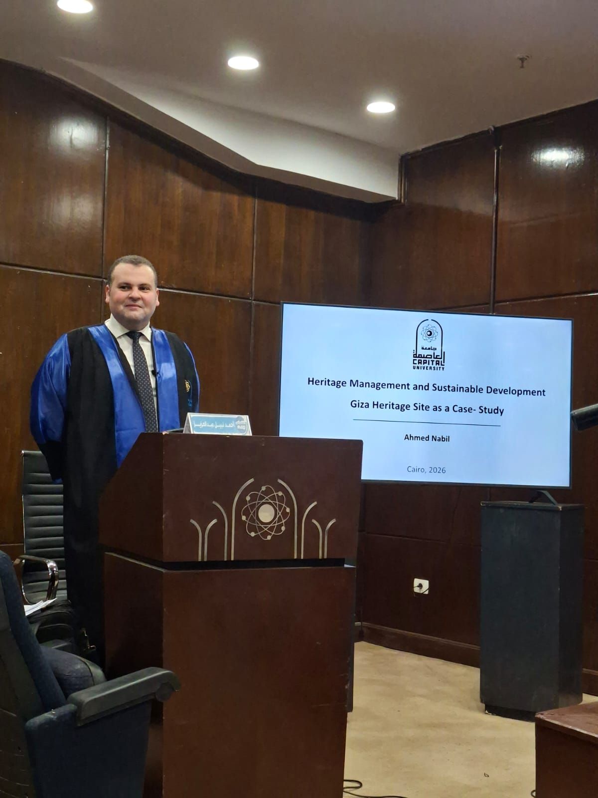 ‎وقد أعقب هذه المناقشات، منح الباحث أحمد نبيل درجة الدكتوراه في إدارة التراث الحضاري والسياحة، من كلية السياحة والفنادق جامعة العاصمة.