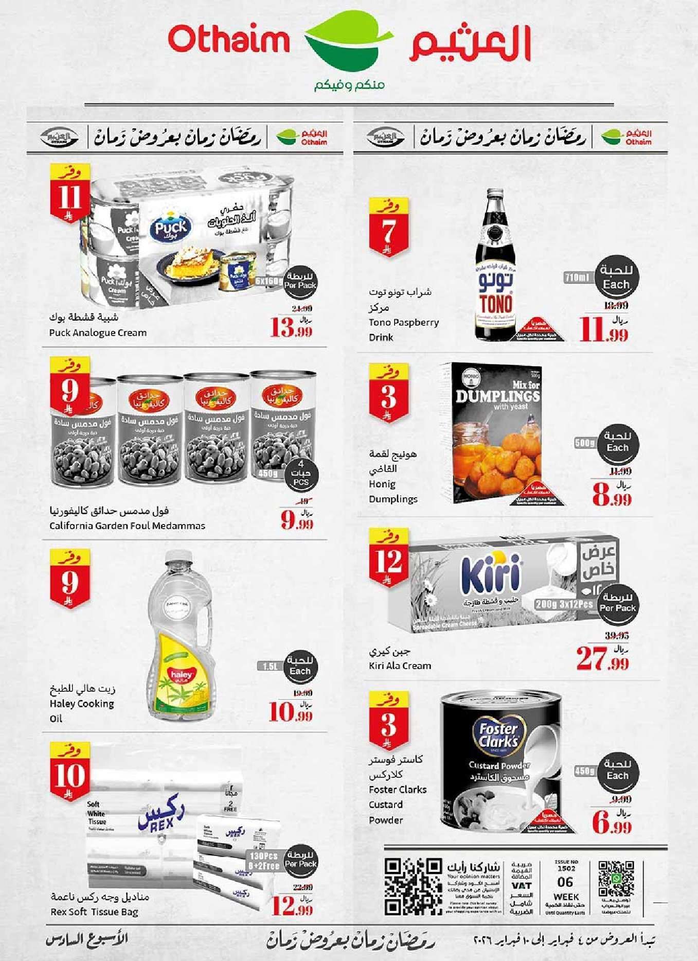 بتوفر ايضا عروض اسواق العثيم هذا الاسبوع علي المنتجات الغذائية و تشمل دجاج ساديا وأرز الوليمة وزيت ليزا وسكر حلواني وشاي الكبوس وحليب نادك وجبنة كرافت ومعجون طماطم وزيت زيتون وتفاح ولحم مفروم احسبها صح كاشك بجيبك