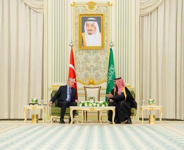 والتقى صاحب السمو الملكي الأمير محمد بن سلمان بن عبدالعزيز آل سعود ولي العهد رئيس مجلس الوزراء، فخامة رئيس جمهورية تركيا السيد/ رجب طيب أردوغان، بقصر اليمامة في مدينة الرياض، ونقل سموه إلى فخامته تحيات خادم الحرمين الشريفين الملك سلمان بن عبدالعزيز آل سعود، وتمنياته لفخامته موفور الصحة والعافية، ولجمهورية تركيا وشعبها الشقيق المزيد من التقدم والرقي، وطلب فخامته من سمو ولي العهد نقل تحياته وأصدق تمنياته إلى خادم الحرمين الشريفين الملك سلمان بن عبدالعزيز آل سعود، دوام الصحة والعافية، وللشعب السعودي الشقيق النماء والرخاء. وعقدا جلسة مباحثات رسمية، استعرضا خلالها العلاقات التاريخية بين البلدين الشقيقين وسبل تطويرها في جميع المجالات.