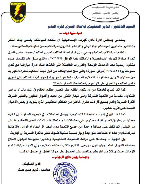 الأربعاء، 04 فبراير 2026 10:19 صأرسل مسئولو نادى كهرباء الإسماعيلية احتجاجا رسميا إلى الاتحاد المصرى لكرة القدم، على تعيين الحكم محمد عباس قابيل ، المقرر أن يدير مباراة الفريق امام الزمالك اليوم بالجولة السابعة عشر من بطولة الدورى الممتاز.