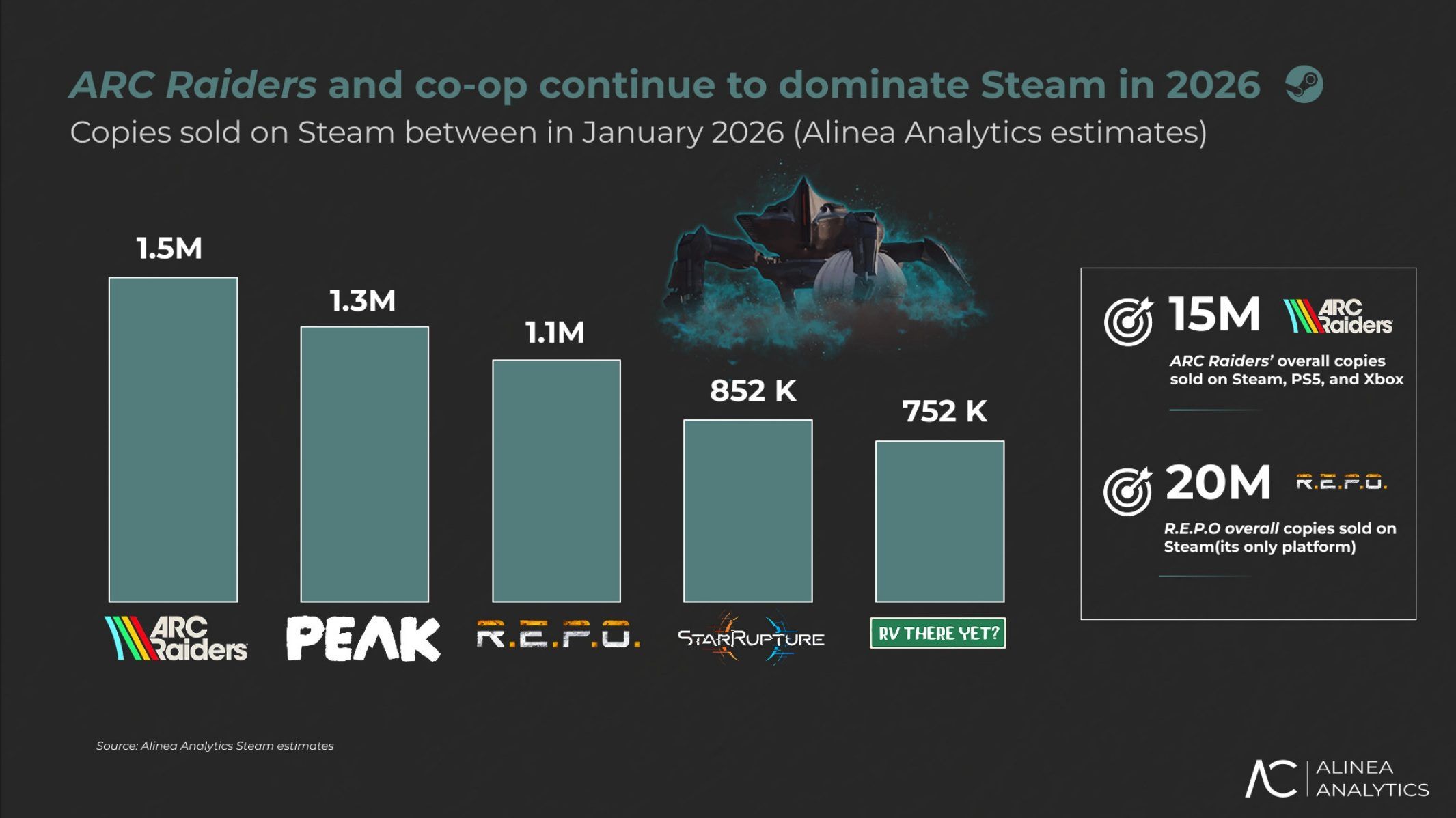 في يناير 2026 وحده، باعت ARC Raiders نحو 1.5 مليون نسخة إضافية على Steam، و1.7 مليون نسخة على منصات بلايستيشن وإكس بوكس، لترتفع مبيعاتها الإجمالية إلى نحو 15 مليون نسخة عبر جميع المنصات، محققةً إيرادات تُقدّر بـ 500 مليون دولار.