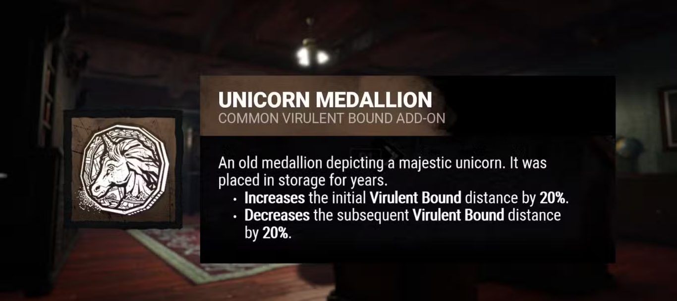تعد إضافة Unicorn Medallion من الإضافات القوية والمفيدة بشكل عام لشخصية The Mastermind في لعبة Dead By Daylight حيث تؤثر بشكل مباشر على طريقة عمل قدرة Virulent Bound وتغير أسلوب استخدامها أثناء المطاردات.