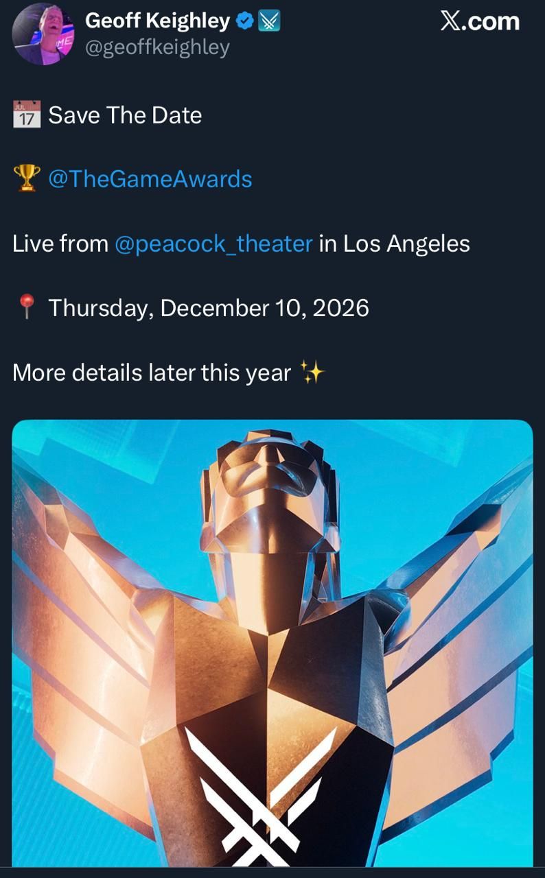 تم تحديد الموعد الرسمي لحفل The Game Awards 2026، حيث سيُقام الحدث السنوي الأبرز في صناعة ألعاب الفيديو يوم الخميس 10 ديسمبر، وذلك على مسرح Peacock Theatre في مدينة لوس أنجلوس، بحسب ما أعلنه جيف كيلي، مبتكر ومنتج ومقدم الحفل، في بيان رسمي نُشر يوم الاثنين.