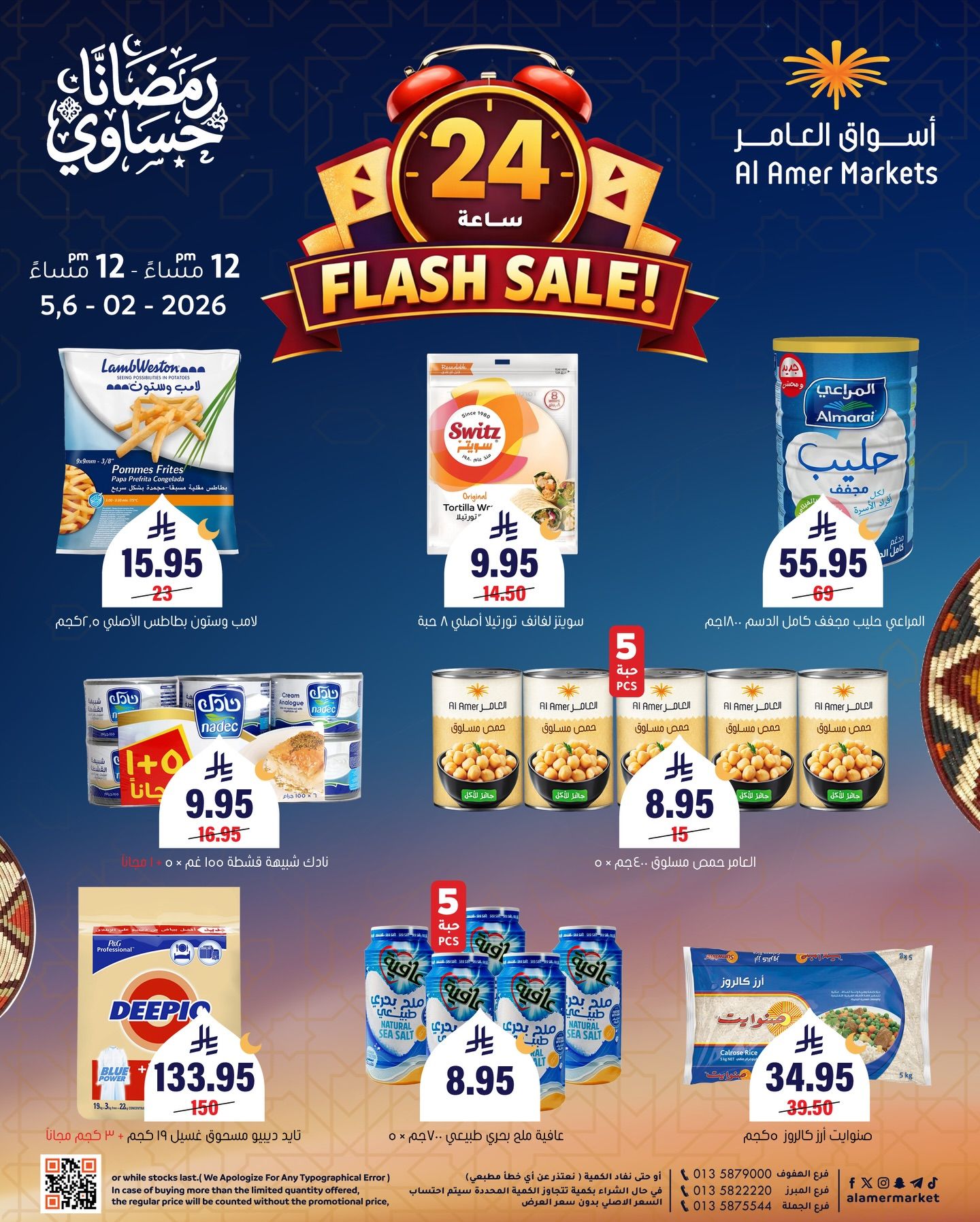 اسواق العامر الخميس 5-2-2026 الموافق 17 شعبان 1447هـ و تحتوي علي لامب وستون بطاطس أصلي و سويتز لفائف تورتيلا أصلي و المراعي حليب مجفف كامل الدسم و نادك شبيهة قشطة و العامر حمص مسلوق و عافية ملح بحري طبيعي و صنوايت أرز كالروز و تايد ديبيو مسحوق غسيل وغيرها من الاصناف و باقل سعر