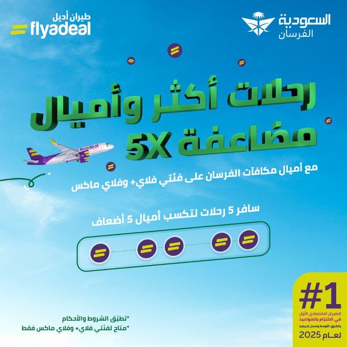 عروض طيران اديل رحلات اكثر اميال اكثر x5 ساري حتى 18 مارس 2026 كل رحلة تزيد رصيدك ومع الجائزة الكبرى تتضاعف أميالك 5X احجز الآن وسافر بأقل الأسعار وعلى الوقت مع طيران أديل لا تفوت افضل الرحلات و اسعار منافسة.