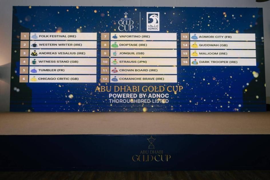 أسفرت القرعة الرسمية لسباق كأس أبوظبي الذهبي للخيول المهجنة الأصيلة «قوائم»، تحديد البوابات، عن انطلاقة متكافئة للخيول المنافسة في السباق المقرر السبت في الشوط السابع والرئيسي لمسافة 1600 متر، وجائزته مليون دولار برعاية «شركة أدنوك»، بمشاركة 16 خيلاً، على مضمار أبوظبي للسباق.