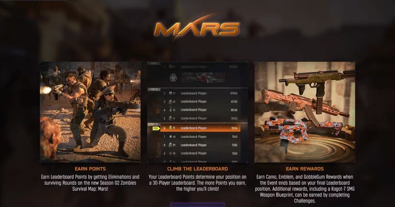 يمثل هذا الحدث إضافة مهمة لموسم Season 2 حيث يجمع بين التحدي الفردي والتنافس العالمي داخل نمط Zombies. Mars Survival لا يضيف فقط تجربة جديدة بل يمنح اللاعبين هدفا طويل المدى يتمثل في التفوق على الآخرين وتحقيق أعلى الأرقام الممكنة. حدث Mars Leaderboard Event يعزز من قيمة هذا الطور ويمنح اللاعبين حافزا واضحا لخوض التجربة مرارا وتكرارا من أجل الحصول على جميع المكافآت المتاحة.