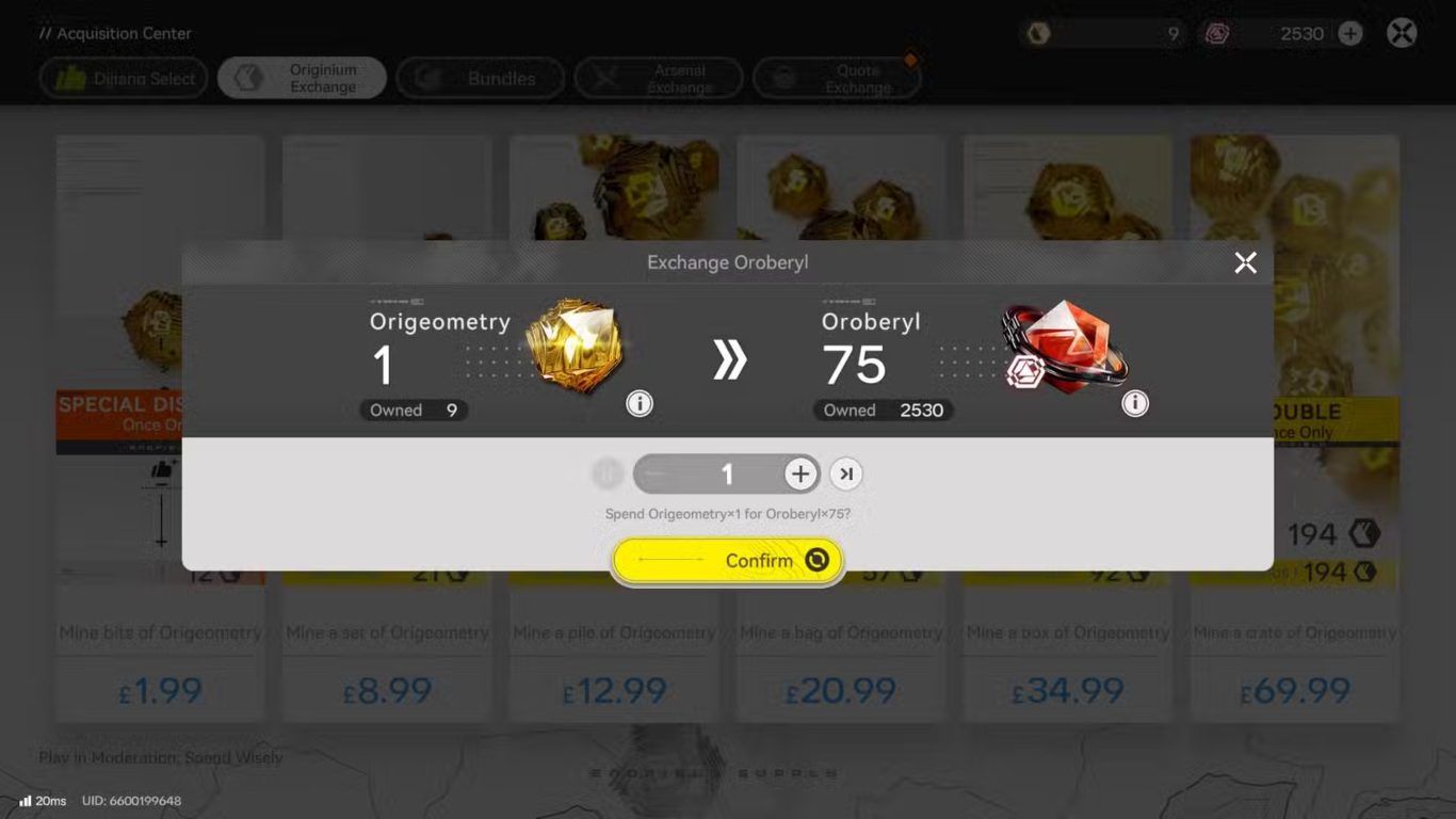 عند تحويل Origeometry إلى Oroberyl يحصل اللاعب على 75 Oroberyl مقابل كل وحدة واحدة من Origeometry وهو معدل تحويل مباشر يجعل هذه العملة أداة فعالة لتعزيز فرص السحب دون انتظار مكافآت القصة أو الأنشطة الجانبية.