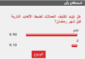 وأيد 90% من القراء مطالب تكثيف الحملات لضبط الألعاب النارية قبل شهر رمضان، بينما عارض 10% من القراء مطالب تكثيف الحملات لضبط الألعاب النارية قبل شهر رمضان.