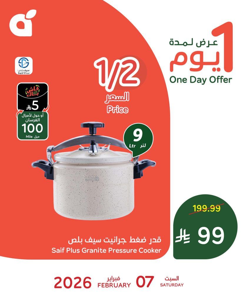 نقدم لكم احدث عروض بنده السبت 7 فبراير 2026 الموافق 19 شعبان 1447هـ و بتحتوي علي افضل الاجهزة الكهربائية و الضرورية في اي منزل خاصة المطبخ لتحضير الطعام و هي قدر الضغط السيف بلص في عرض حصري بنصف السعر و متاح اليوم فقط ابقوا معنا ليصلكم كل جديد