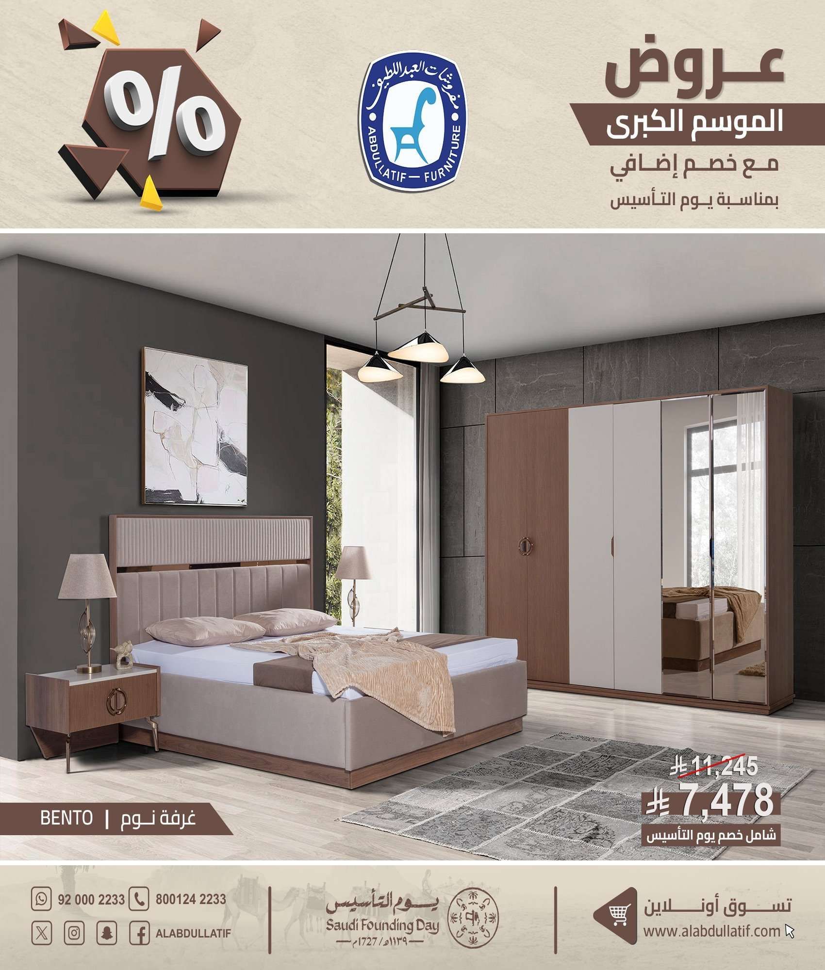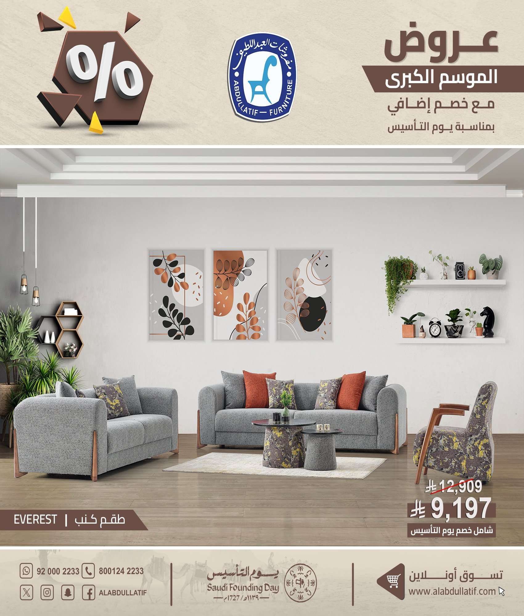 عروض مفروشات العبداللطيف بمناسبة يوم التأسيس 7 فبراير 2026 منتجات متنوعة بأقوى الاسعار عروض الموسم الكبرى أحدث وأجود أنواع الأثاث المنزلي والأثاث المكتبي والسجاد الفاخر تسوق أون لاين من الموقع الالكتروني.