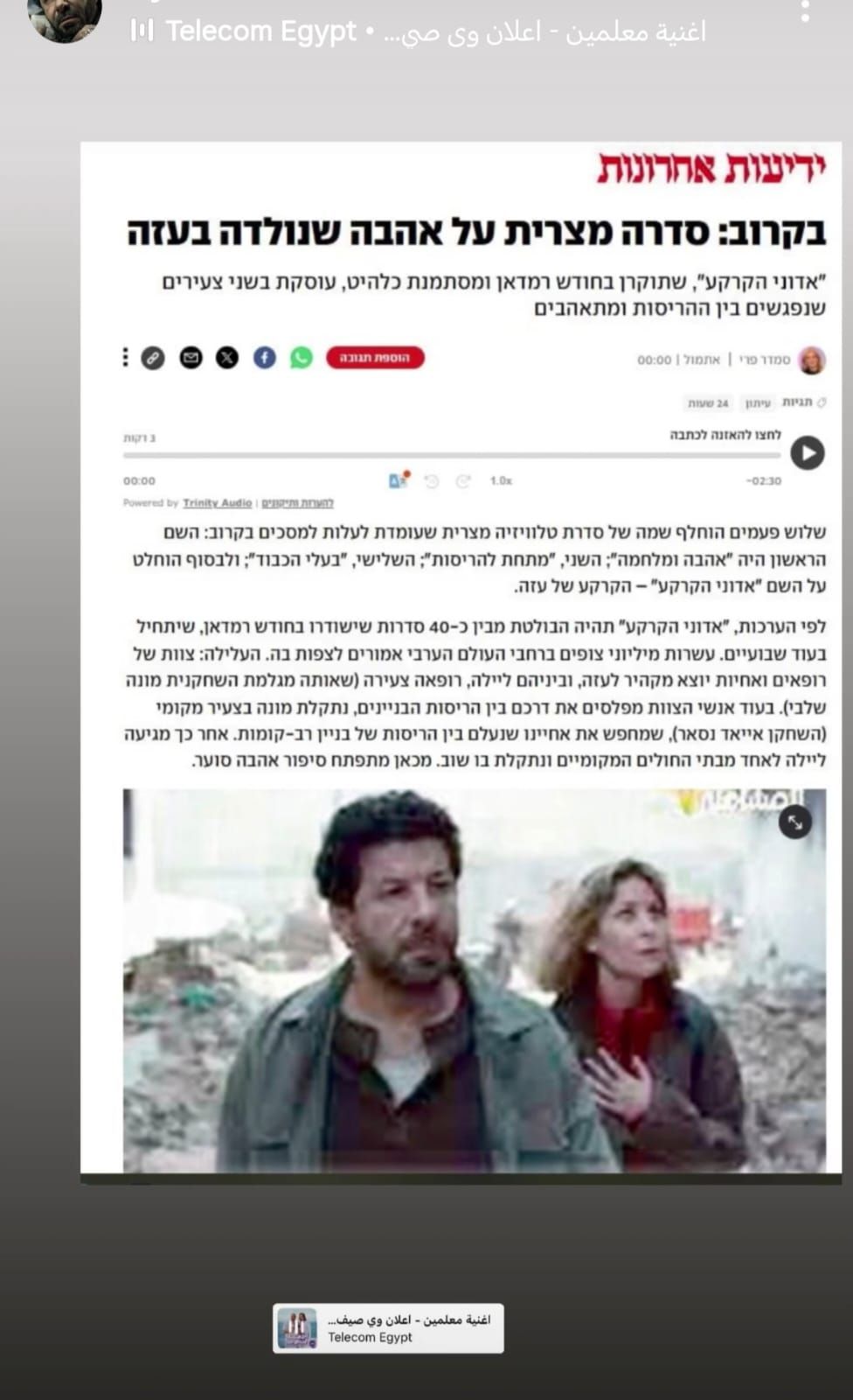 ونشر نصار صورة المقال عبر خاصية الاستوري على حسابه الرسمي بموقع إنستجرام، مرفقًا إياها بأغنية "لا دا إحنا معلمين على ناس كتير أوي"، في إشارة لمدى تفاعل الاحتلال الإسرائيلي بالمسلسل المنتظر عرضه وكيف أثار غضب قوات الاحتلال وارتباكهم، لخوفهم من فضح ممارساتهم بحق الشعب الفلسطيني أمام الرأى العام العالمي.