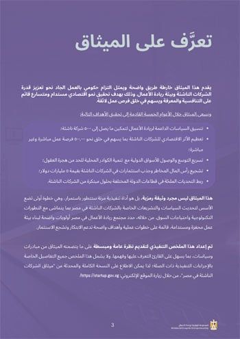ويُمثل "ميثاق الشركات الناشئة"، يمثل خارطة طريق استراتيجية تهدف إلى تعزيز بيئة ريادة الأعمال، وجعلها أكثر مرونة واستجابة لمتغيرات العالم، وهو ليس مجرد وثيقة رمزية، بل هو أداة تنفيذية مرنة تتطور باستمرار، وتضع الأسس لتحديث السياسات والتشريعات بما يتماشى مع التطورات التكنولوجية واحتياجات السوق، مضيفه أن من خلاله يحدد مجتمع ريادة الأعمال في مصر أولويات واضحة لبناء بيئة عمل محفزة ومستدامة، قائمة على خطوات عملية وأهداف واضحة تدعم الابتكار وتشجع الاستثمار.
