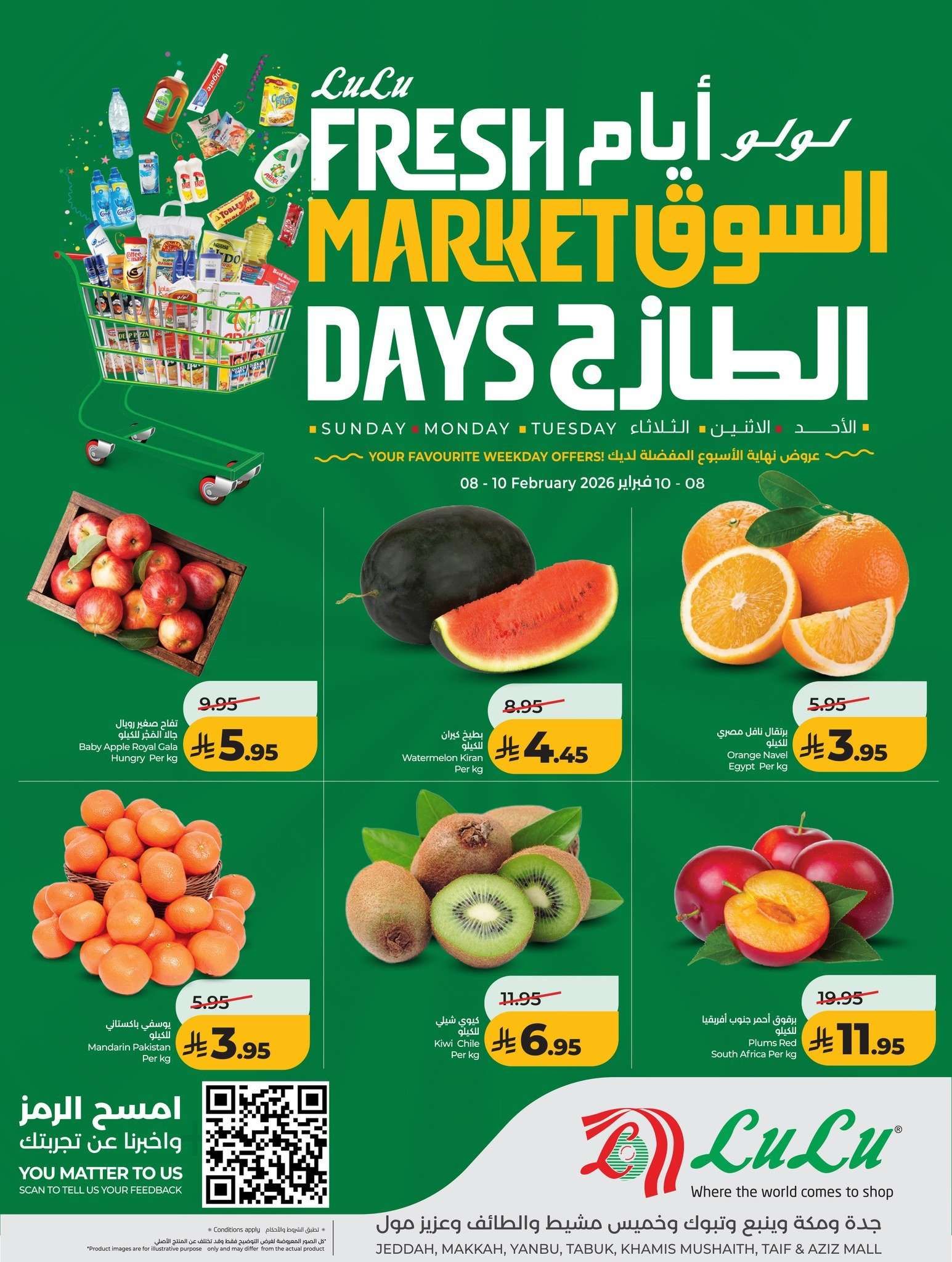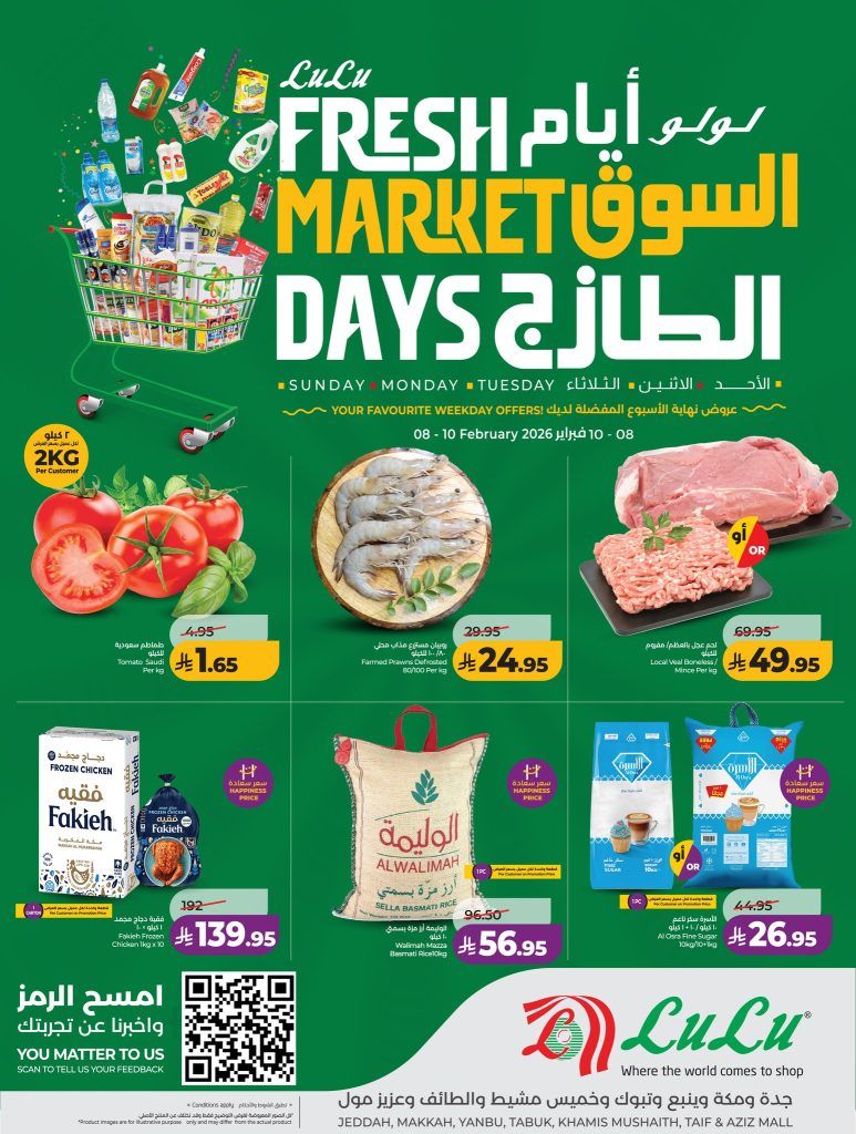 نقدم لكم عروض لولو جدة الاحد 8-2-2026 – 20 شعبان 1447هـ و تحتوي علي الفواكه منها مانجو تيمور يمني وفاكهة اللونجان وجزر سعودي وباذنجان كما يشمل الأسماك سمك باراموندي ودنيس وشعور وصافي وخانديلي وسال جيش