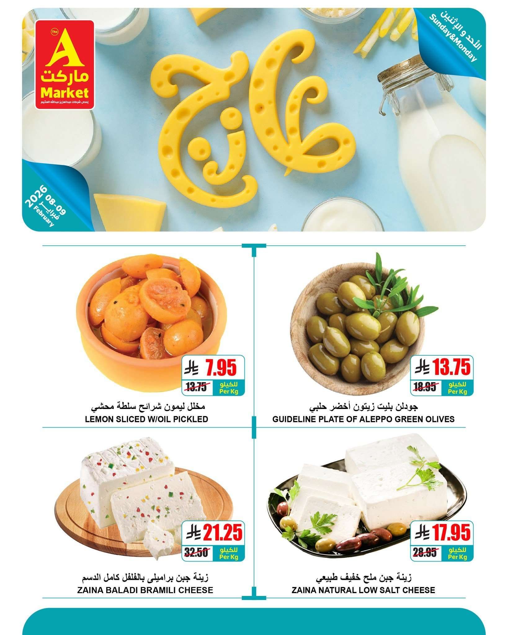 نستعرض لكم عروض ايه ماركت الرياض الاحد 20-8-1447هـ الموافق 8 فبراير 2026 و تحتوي علي المنتجات الطازجة والمجمدة منها جبن براميلي وإسطنبولي وزينة بالفلفل وملح خفيف مع مربى التوت ومخلل الليمون والزيتون الأخضر