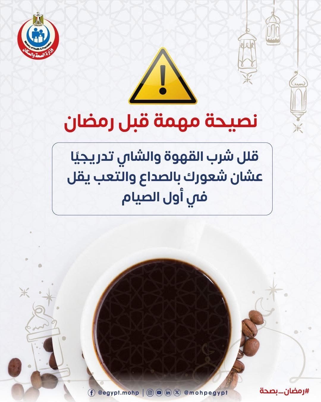 الأحد، 08 فبراير 2026 01:00 صقدمت وزارة الصحة والسكان نصيحة هامة للمواطنين مع اقتراب شهر رمضان المبارك، مشددة على أهمية تقليل استهلاك القهوة والشاي بشكل تدريجي قبل بدء الصيام، لتقليل الشعور بالصداع والتعب خلال الأيام الأولى من الشهر الكريم.