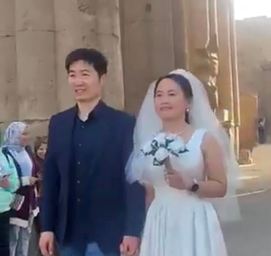 سائح صيني يحتفل مع زوجته بفستان وبدلة الزفاف في معبد الأقصر