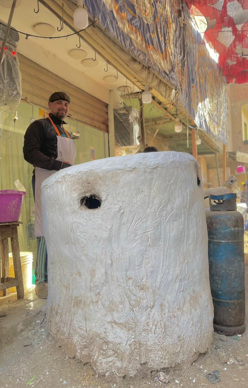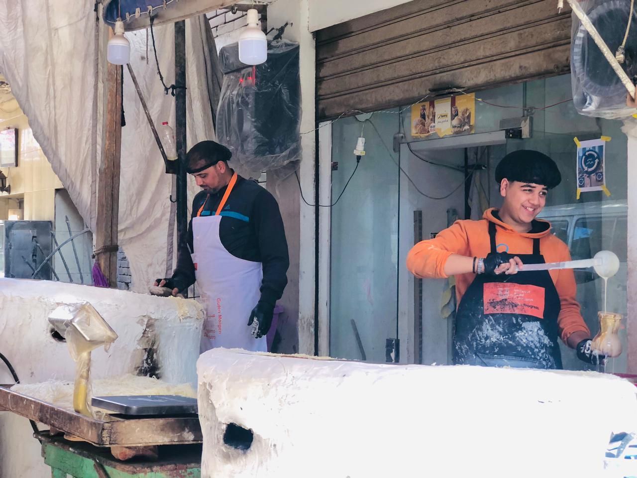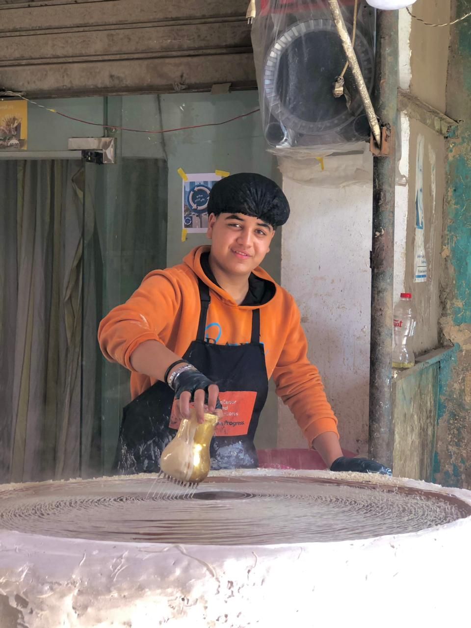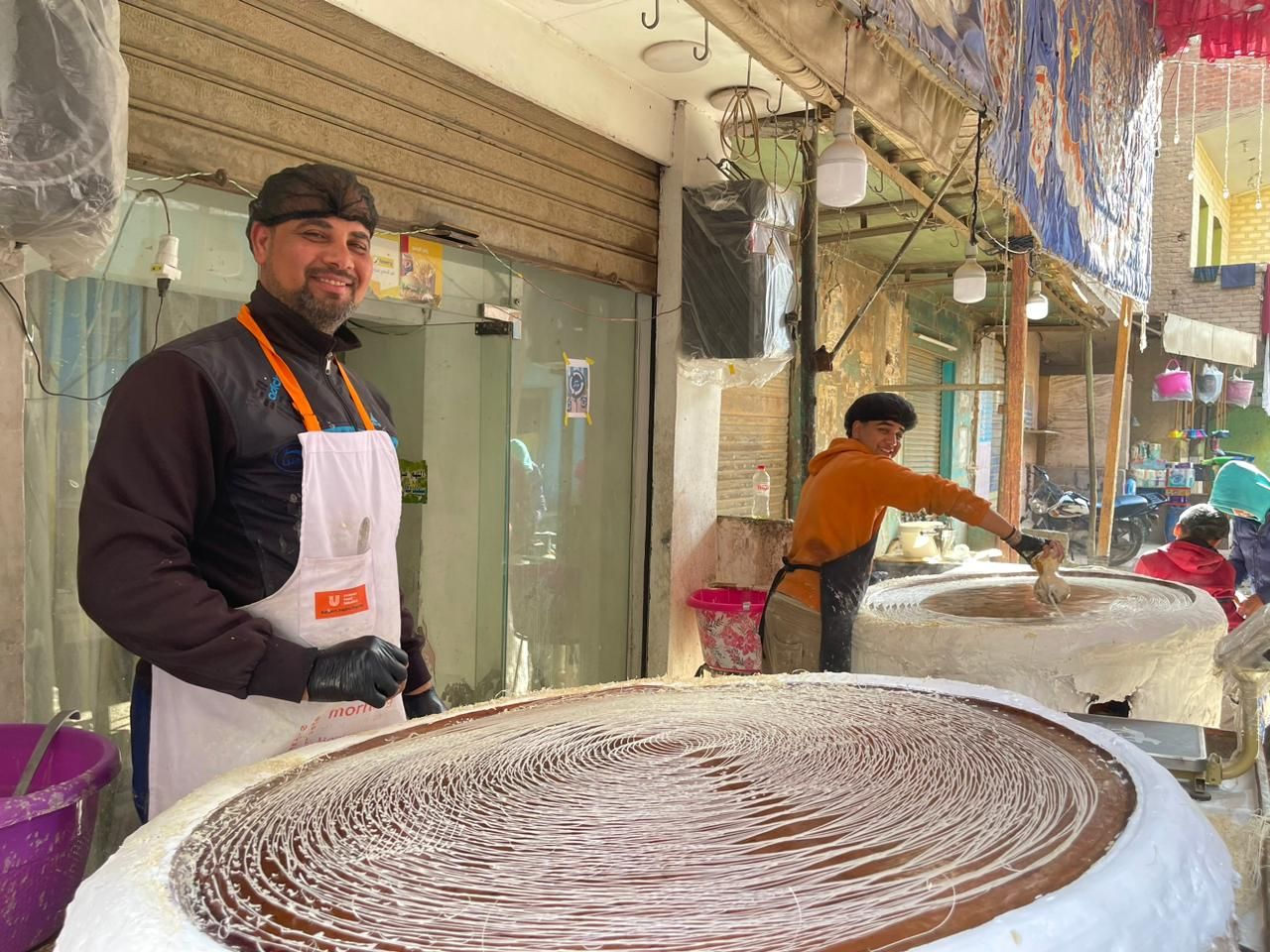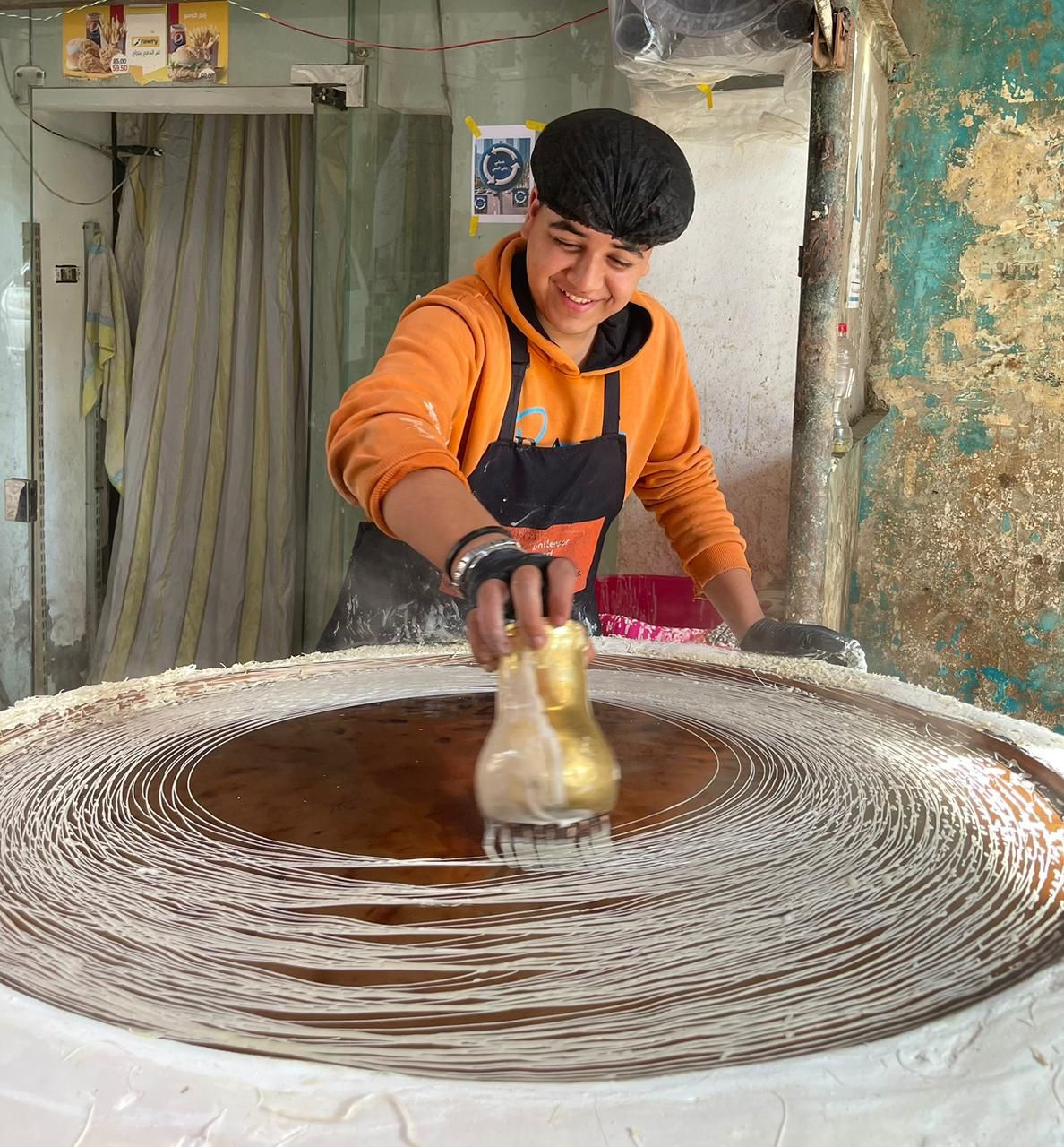 أمام هذا الفرن يقف هاني محمد، كعادته، يتعامل مع التفاصيل بعين الخبير ويد الصانع، يمسك الكوز ويُوزّع عجين الكنافة على صينية الفرن بحركة دقيقة، فتنساب الخيوط الرفيعة متتابعة ومتساوية، كأنها تُنسج على النار نسجًا.