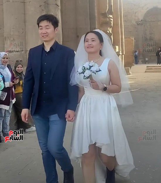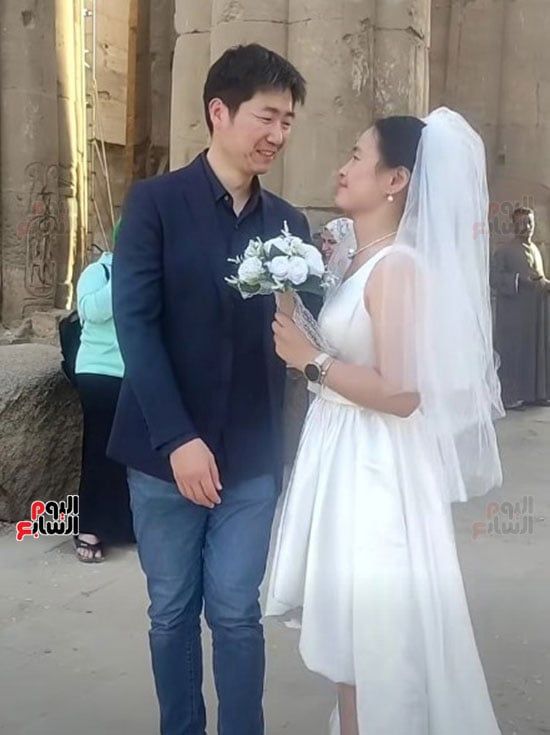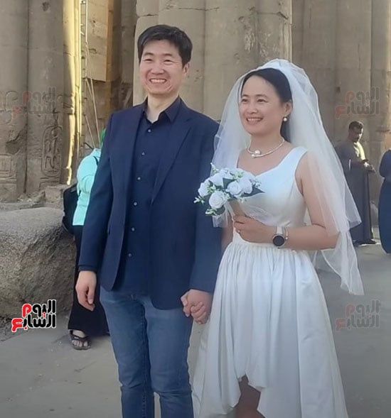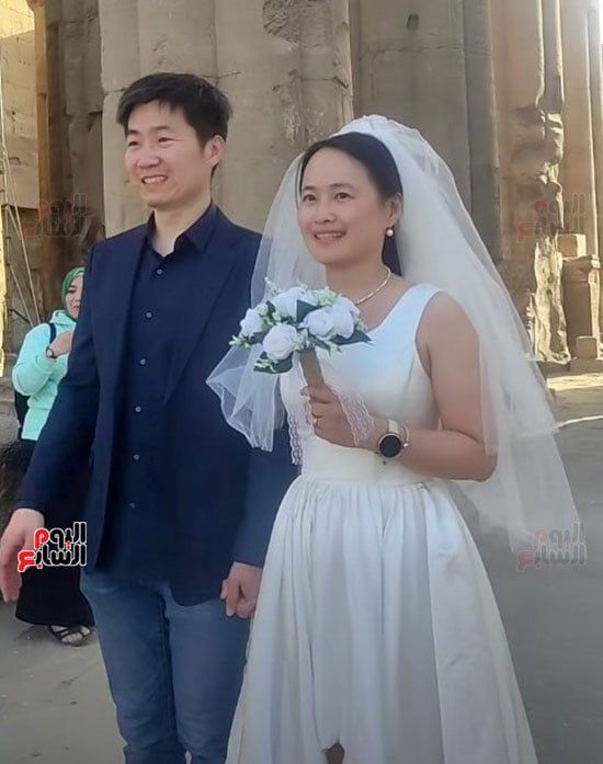 سائح-صيني-يحتفل-مع-زوجته-بفستان-وبدلة-الزفاف-في-معبد-الأقصر